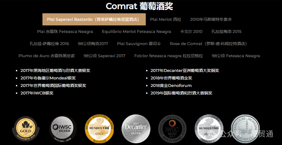 我们为这样的收藏感到自豪 Vinuri de Comrat 如 Plai Moldova,98 公顷,比萨拉比亚普罗旺斯,排毒,民俗,葡萄酒,在橡木桶中陈酿并根据现代酿酒技术生产。每年,我们的葡萄酒都会在世界各地最重要的葡萄酒比赛中获得金奖和银奖:DWWA、Mundus Vini、Mondial de Bruxelles,我们有幸与来自不同国家和大陆的数千个样品竞争。在过去的两年里,Comrat的葡萄酒获得了70多枚奖牌。