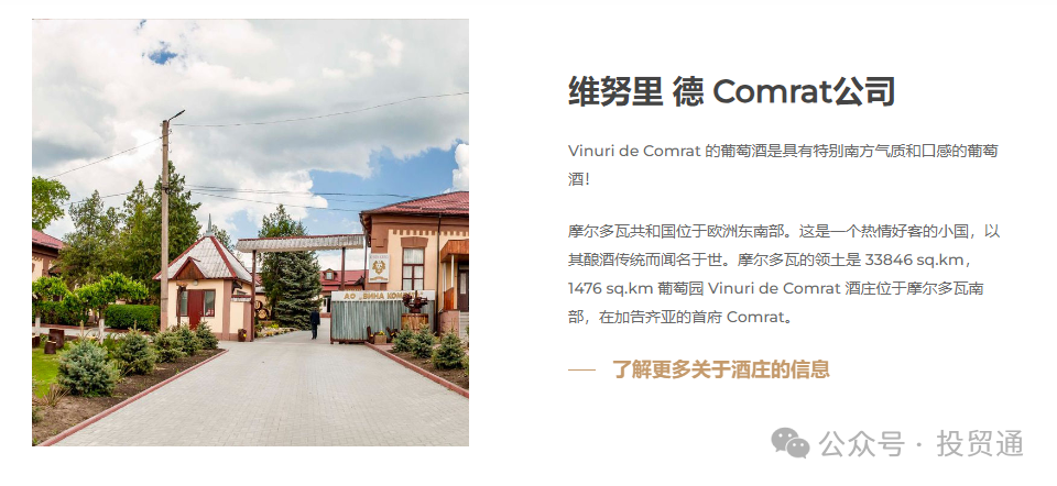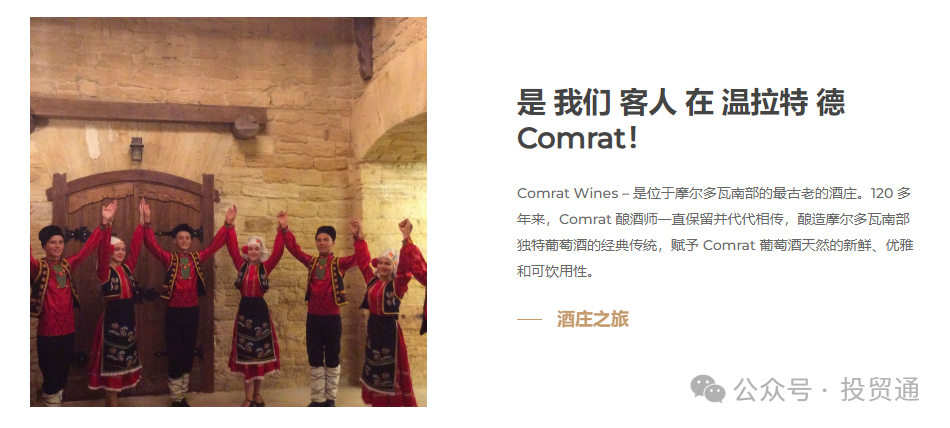公司的骄傲主要是那些真正热爱自己的工作、土地、祖国和酿造葡萄酒的人。因此,每一款葡萄酒,从Vinuri de Comrat的一串葡萄开始,都吸收了酿酒师的爱、耐心、工作和热情。该公司在葡萄栽培区“Valul-lui-Traian”拥有 300 个农场,拥有 5 多公顷的葡萄园目前,Vinuri de Comrat 是摩尔多瓦境内比萨拉比亚省建造的 14 个国有葡萄酒仓库中唯一的一家工厂,仍在工作并保留了其建筑;它是 19 世纪最古老的建筑和工业历史古迹之一。Vinuri de Comrat 无疑是旅游葡萄酒庄园的骄傲,游客在这里体验南方的热情好客,葡萄酒和食物在同一个地方由同一个人制作,这创造了令人难忘的品味、情感和回忆的结合!