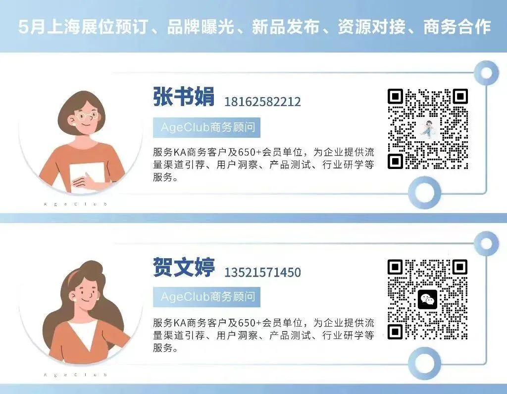 5月15-17日,AgeClub和NHNE联合打造,在中国上海国家会展中心设有银发经济创新巡展—银发乐活馆,赋能食品营养企业布局银发市场,为企业提供经销商、代理商对接服务,限量20席位,展位预定中!文末报名速来!