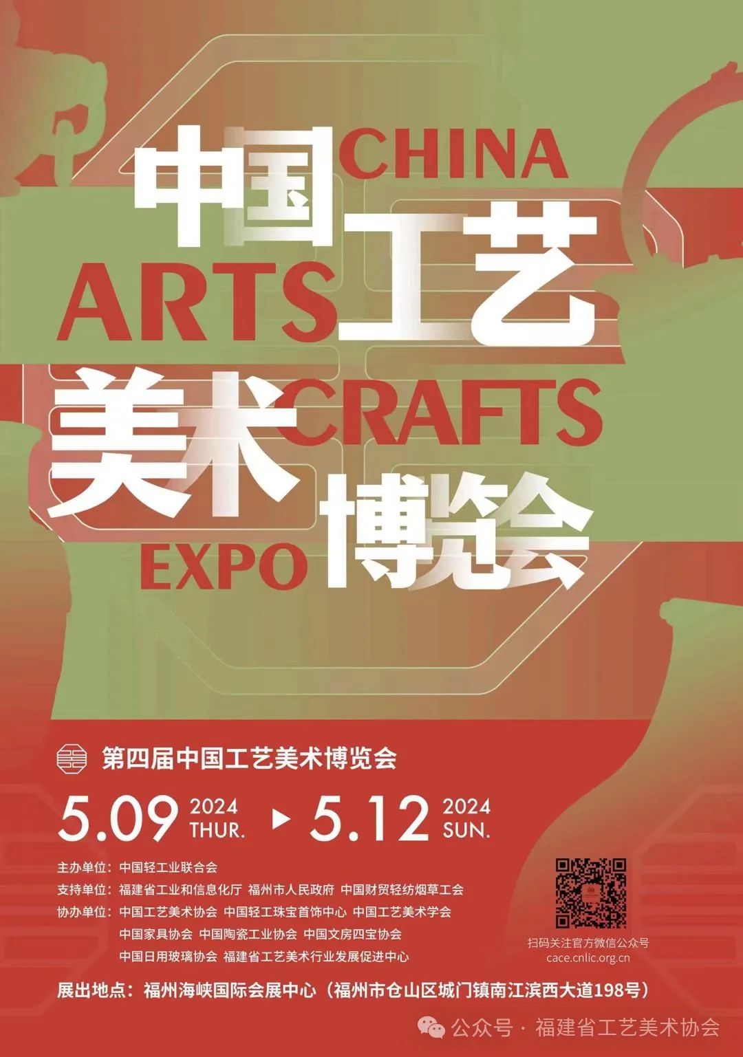 为展示新时代中国工艺美术的丰硕成果,弘扬工匠精神,推动传统工艺高质量发展,服务人民美好生活,助力文化强国建设,中国轻工业联合会定于2024年5月9日-12日在福州举办2024中国工艺美术博览会。博览会将集中展出行业精品佳作,展示传统工艺技艺,展现工艺美术风采,同期组织中国玉石器“百花奖”评选、“百鹤杯”工艺美术设计创新大赛,开展地方特色工美展演、非遗文化体验等活动。