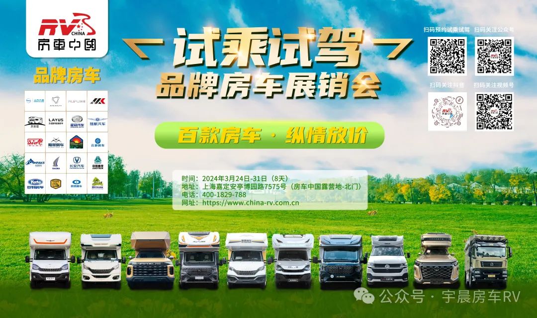 3月24-31日诚挚邀请您前来参加品牌房车试乘试驾展销会!展会提供百款房车供您尽情体验,只需支付三成首付即可开启全新的房车之旅。另外我们还提供房车租赁、二手车交易、房车售后加装、房车露营等服务,以满足不同车友的需求。我们准备了丰厚的豪礼,期待您的光临。