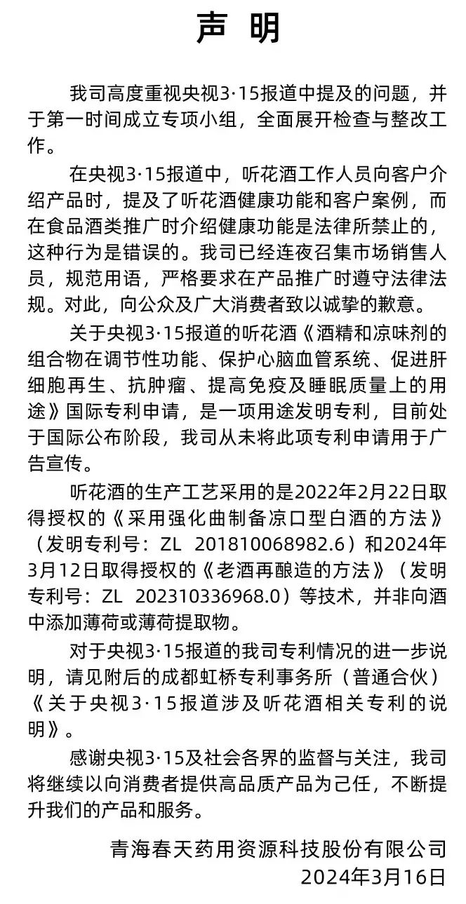 3.15当夜,当地市场监督管理局深夜赶赴现场核实情况并查处,听花酒微信公众号被封,京东等多个电商平台全部下架了所有听花酒。周日,证监会决定对青海春天进行检查,目前检查组已进驻公司开展工作。青海春天第一时间成立了此事件专项小组,3月16日晨,在微博发了解释声明。