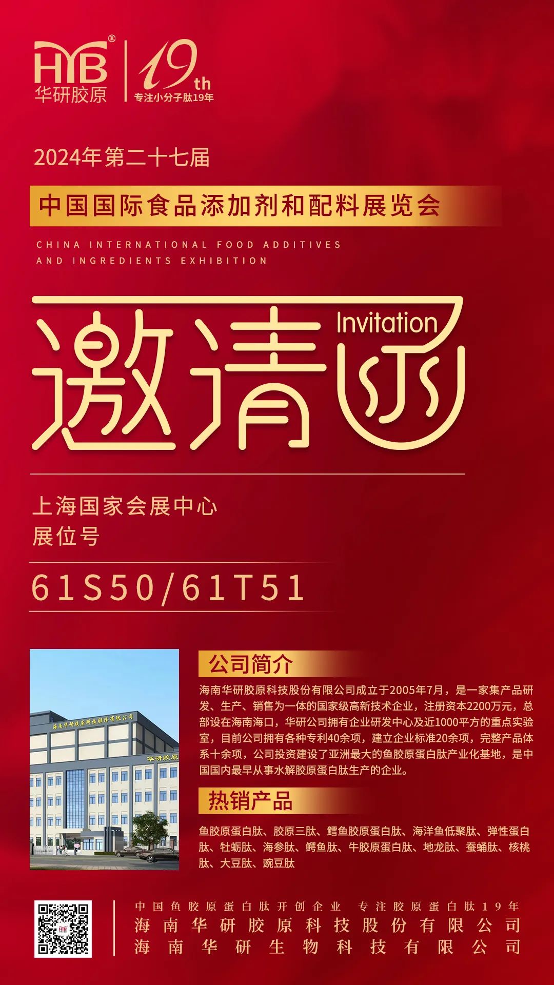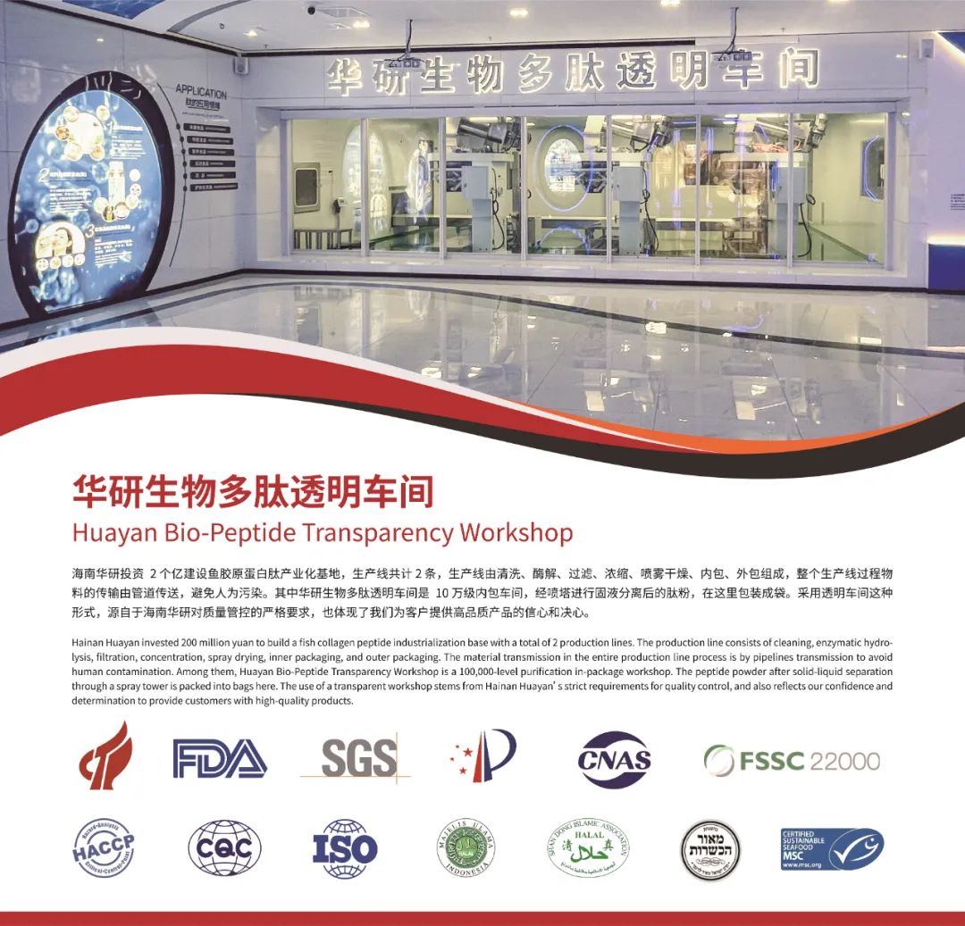 海南华研将携旗下2024年新品系列(液体胶原蛋白肽、白蛋白肽、小球藻活性肽、鹅肌肽等)鱼胶原蛋白系列(鱼胶原蛋白肽、胶原三肽、鳕鱼小分子肽、鱼弹性蛋白肽等)、海洋生物系列(海参肽、牡蛎肽、鲍鱼肽等)、陆生动物系列(牛骨肽、鳄鱼肽、地龙肽等)植物提取系列(大豆肽、玉米肽、豌豆肽等)亮相,这些产品在口服美容、健康食品、功能食品、医疗保健、零食烘焙、宠物营养等领域具有广泛的应用前景。期待通过此次展会,充分展示海南华研企业宗旨、产品品质和研发优势,与新老客户见面交流。