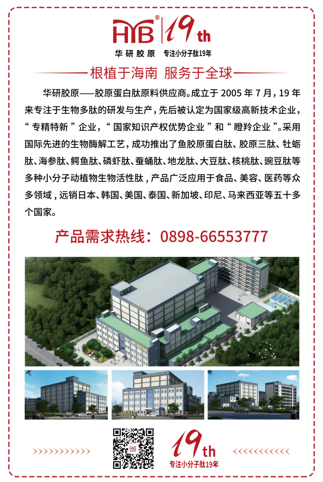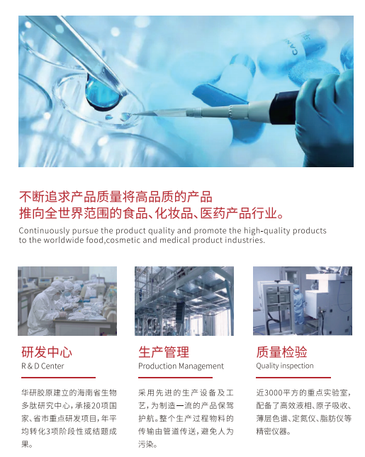 19年来,海南华研全体同仁矢志不渝地坚持“投身胶原蛋白事业,服务人类健康”的理念,专注于海洋生物和鱼类中提取高附加值的营养品的研发、生产与销售,公司以海洋生物为原料,通过生物酶解工艺生产鱼胶原蛋白肽、海参肽、牡蛎肽、鲍鱼肽、金枪鱼肽等产品广泛应用于保健品、美容护肤品和医疗用品以及玉米肽、大米肽、豌豆肽、大豆肽等植物提取物系列产品,本着“根植于海南,服务于全球 ”的宗旨定位,产品远销日本、韩国、美国、泰国、新加坡、印尼、马来西亚等50多个国家与地区。