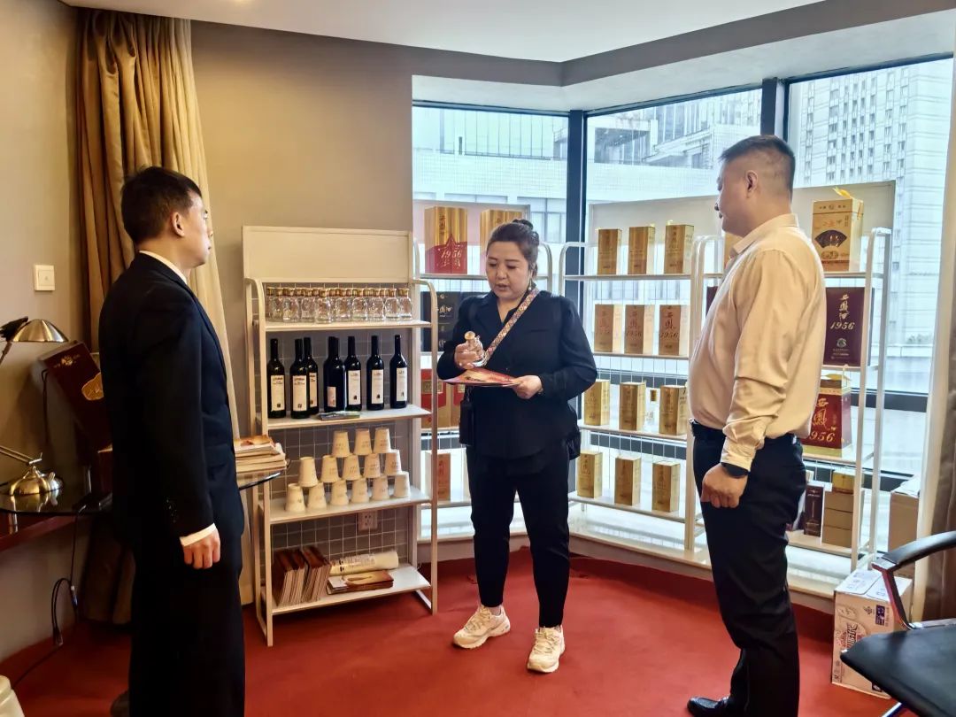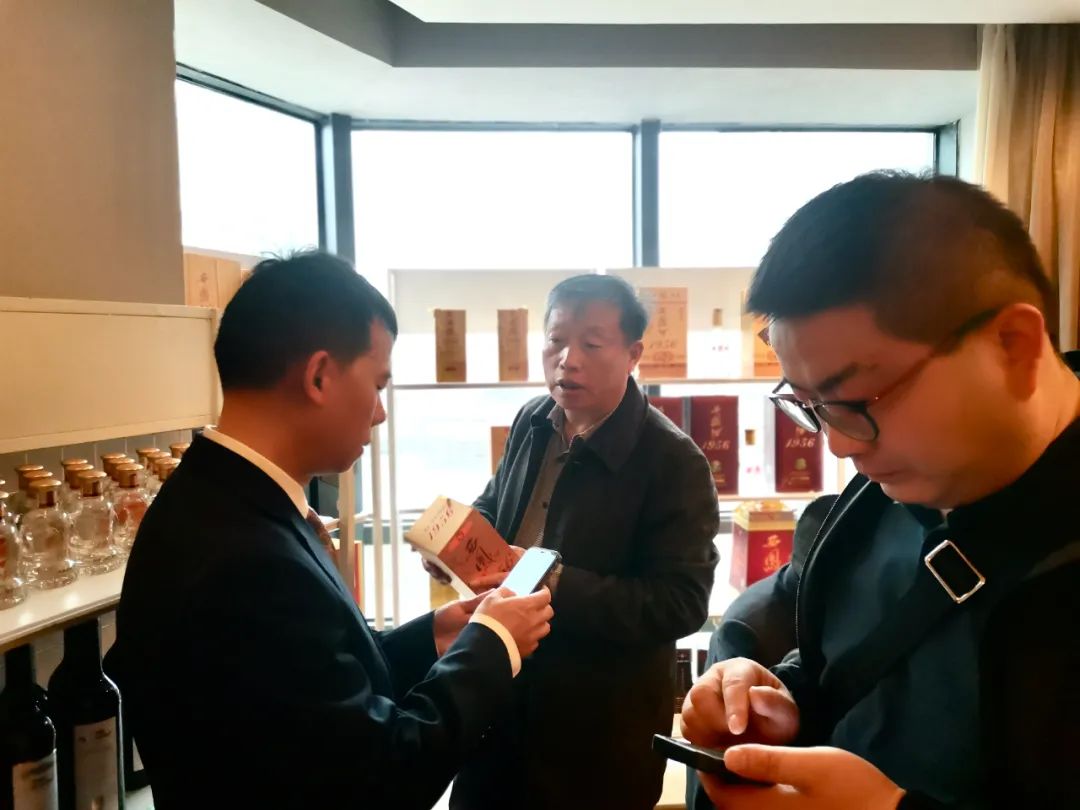 3月17日上午,陕西糖酒副食流通协会会长宣保国一行莅临岷山饭店416的1956西凤酒展厅,并做工作指导。