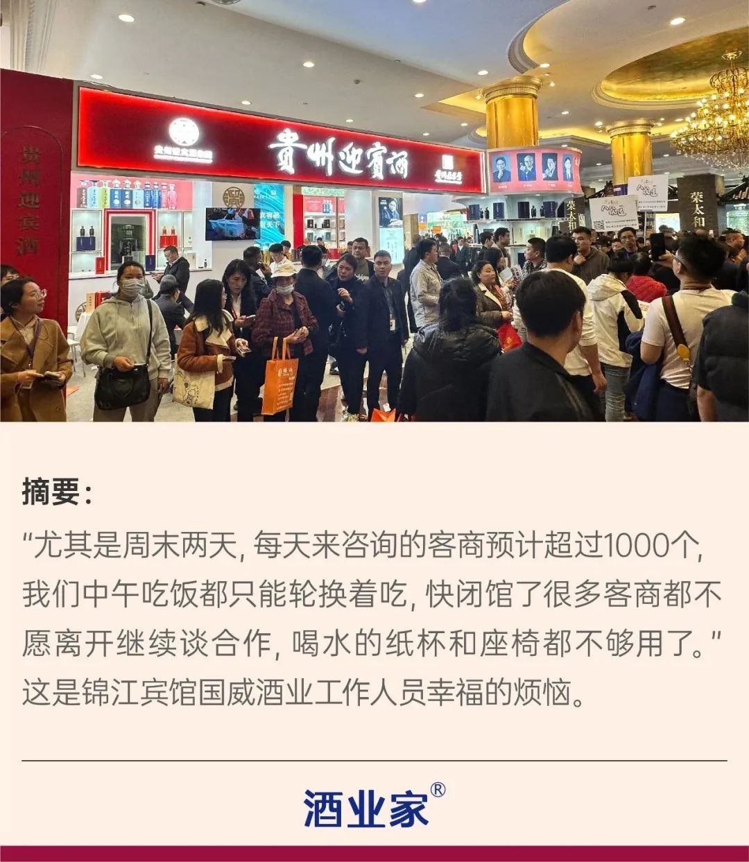 “尤其是周末两天,每天来咨询的客商预计超过1000个,我们中午吃饭都只能轮换着吃,快闭馆了很多客商都不愿离开继续谈合作,喝水的纸杯和座椅都不够用了。”这是锦江宾馆国威酒业工作人员幸福的烦恼。