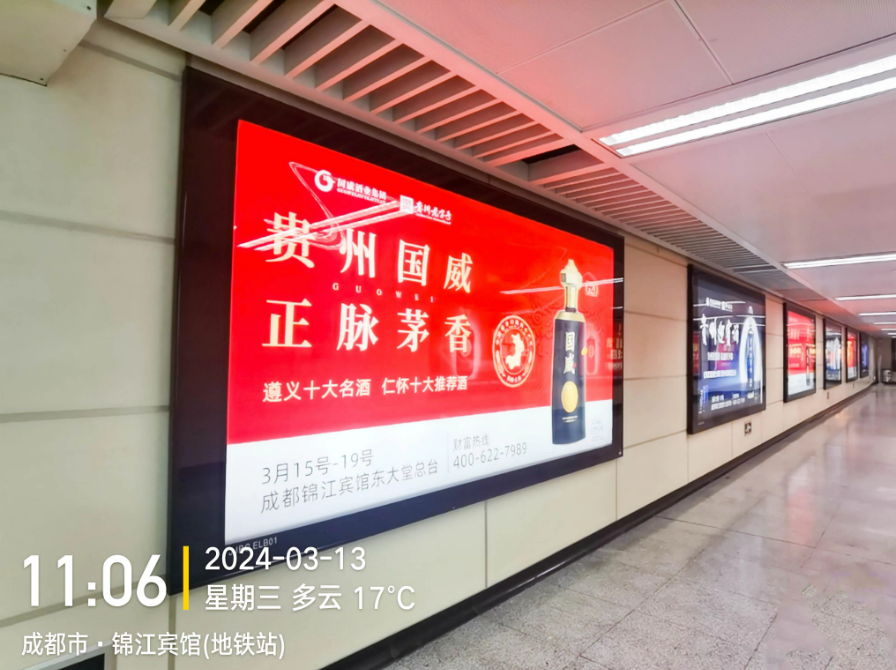 在天府机场,入眼便可看见,国威的巨幅广告正持续向往来的参会经销商输出品牌信息,率先占领客商心智;在高铁站,被誉为成都流量担当的成都地铁一号线,成都锦江宾馆地铁站等流量密集地,交替出现的贵州迎宾酒与贵州国威酒的身影,多点营造着浓厚的国威氛围。