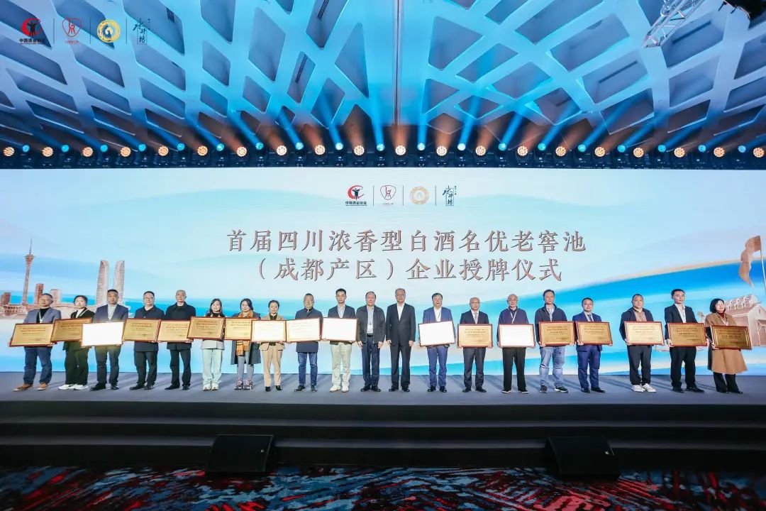 此外,现场举行了首届四川浓香型白酒名优老窖池(成都产区)授牌仪式,为产区36家酒企颁发了证书(其中邛崃20家,占全川入选酒企的13.7%),并授予水井坊“老窖池保护领军企业”荣誉称号。