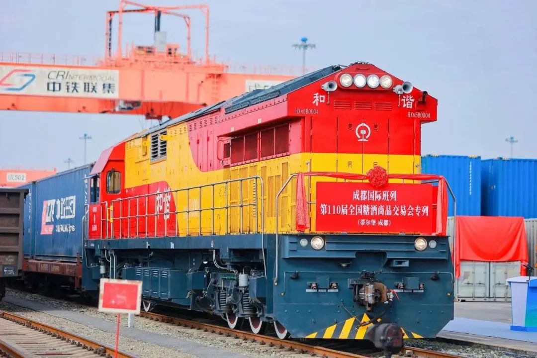 3月14日,成都国际班列“第110届全国糖酒商品交易会专列”接车仪式在成都国际铁路港举行。这趟始发于荷兰蒂尔堡的成都糖酒会专列,搭载着精选巧克力、太妃糖和优质红酒,横跨欧亚大陆,途经白俄罗斯、俄罗斯、哈萨克斯坦等国抵达成都。