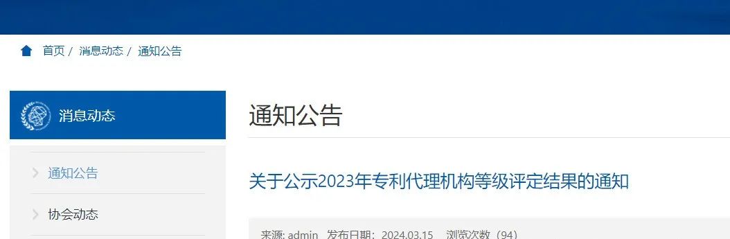 现对2023年专利代理机构等级评定结果进行公示(见附件),公示期自2024年3月15日起至2024年3月21日止。如对专利代理机构等级评定结果存在异议,请在公示期内向评定工作组提交书面材料。