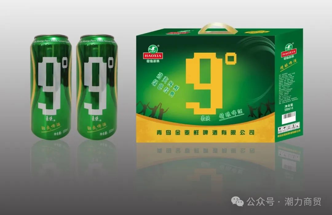 豪侠9度劲爽易拉罐啤酒500ml; 由青岛金麦鲜啤酒有限公司荣誉出品