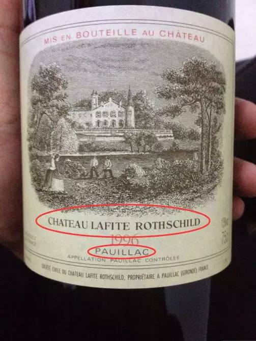 拉菲古堡(Chateau Lafite Rothschild) 别名:大拉菲或正牌拉菲,我们所说的正牌拉菲是指酒庄最顶级的产品,代表着拉菲酒庄的酒,它是纯手工采摘,平均树龄收在45年以上,正牌拉菲都会出现下图圈起来的英文。