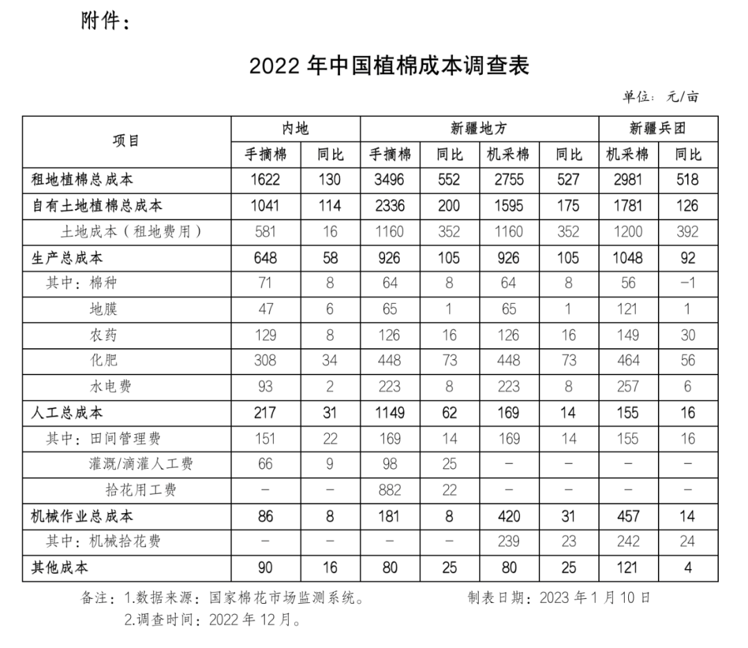 为全面了解2022年棉花种植成本情况,国家棉花市场监测系统于2022年12月在全国范围展开棉花种植成本调查,样本涉及14个省(自治区)、46个植棉县、1700个定点植棉信息联系户。调查结果显示,2022年全国棉花种植总成本上涨,新疆地区涨幅相对较大。具体情况如下:
