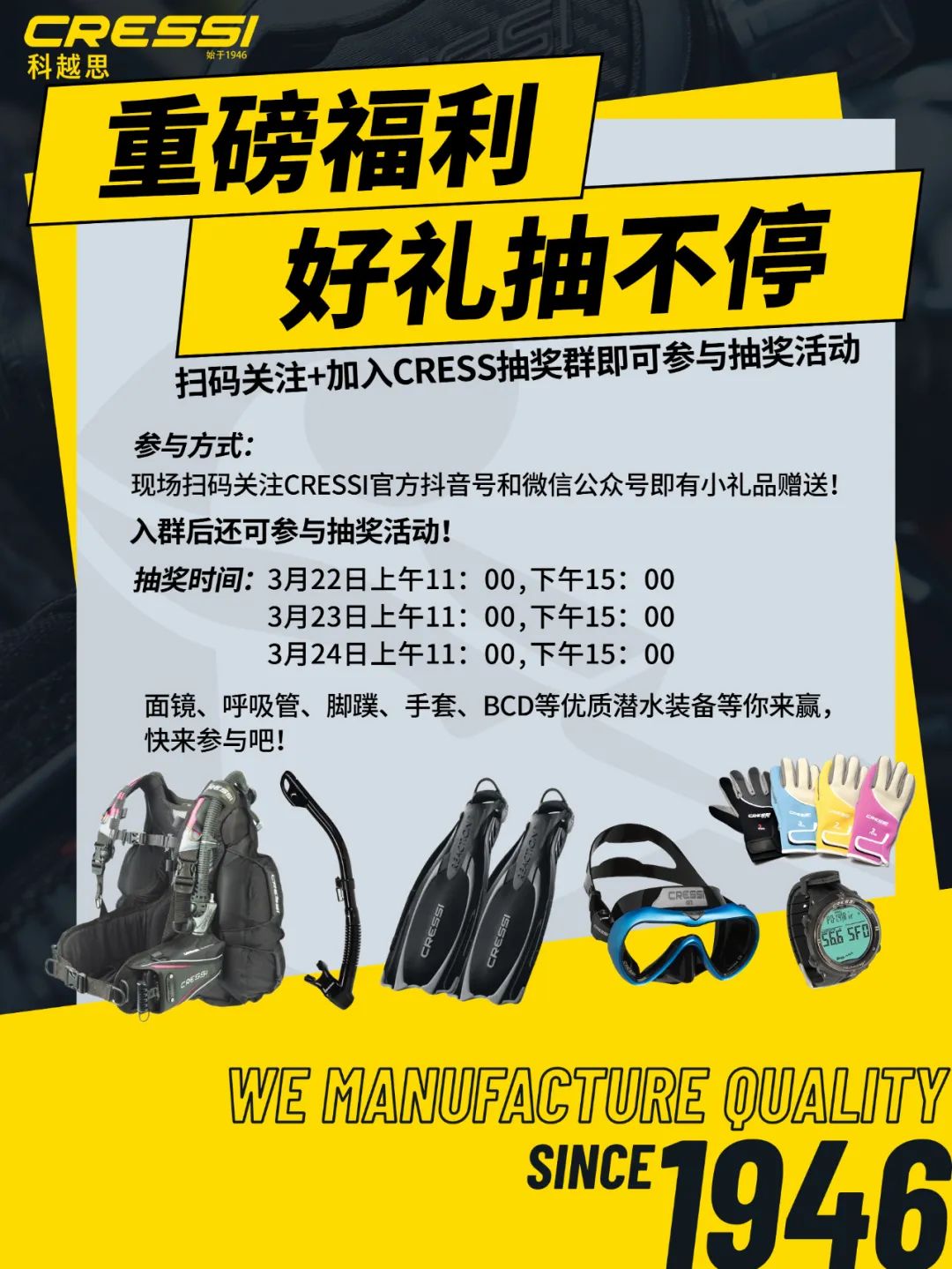 现场扫码加入CRESSI DRT抽奖群即能参加抽奖活动,面镜、呼吸管、脚蹼、手套、BCD等大奖等你来抽取!