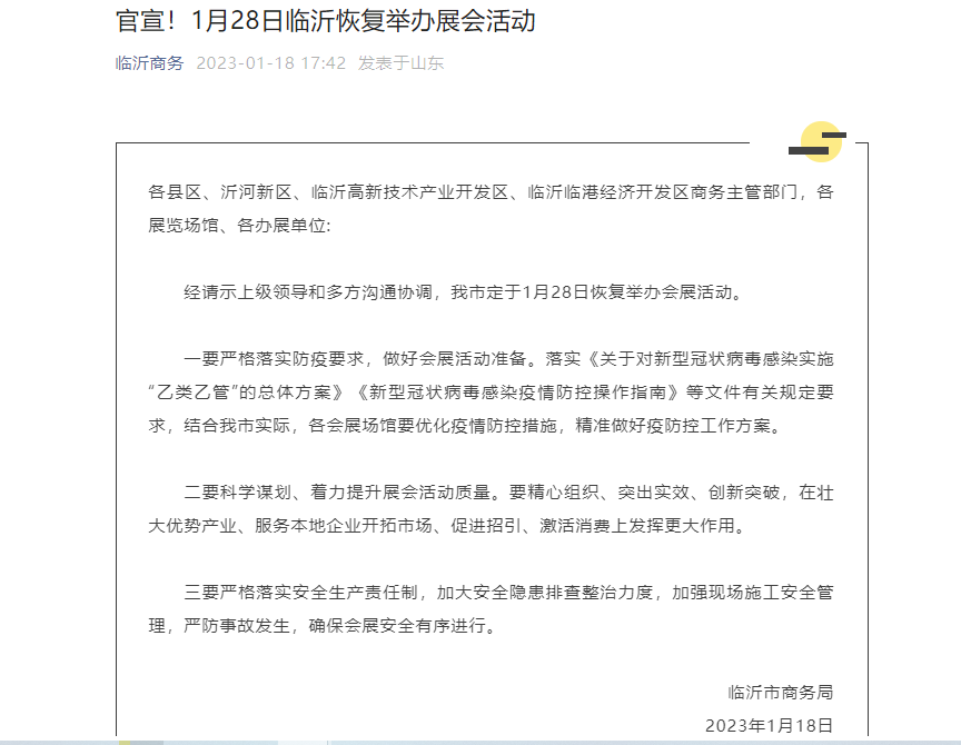1月18日,临沂市商务局官方公众号发布通知,宣布经请示上级领导和多方沟通协调,临沂市定于1月28日恢复举办会展活动。