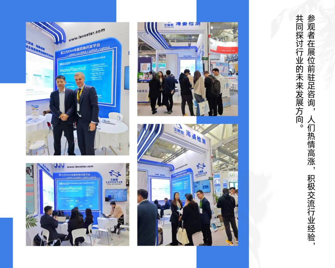 在本次展会中,左旋星生物于C3馆的C040展位与众多参观者相聚。我们推出的第三代mRNA专属质粒平台——monoPlasmid,结合海晏检测推出的双惠活动,成功吸引了行业内众多客户的关注。