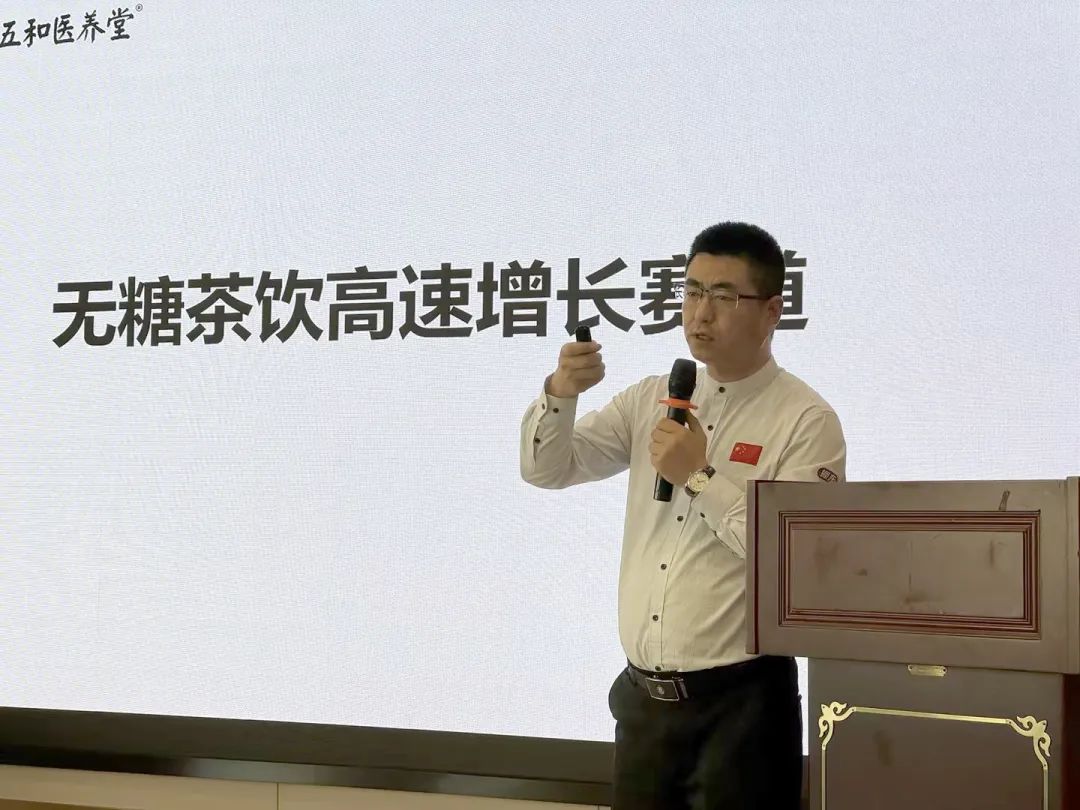 五和医养堂营销总经理鹿强老师为前来参会嘉宾介绍振东五和医养堂的发展、健康理念,所取得的成就,并重点推出无糖茶饮“神农浅尝”。