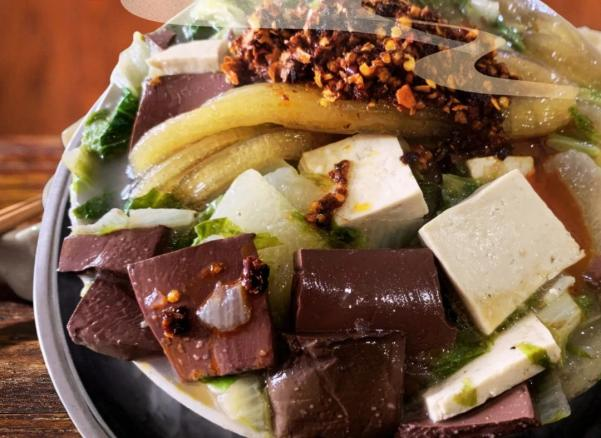 扁粉菜以红薯粉条做主料,配以青菜、豆腐、猪血等,在一口大铁锅中熬煮。