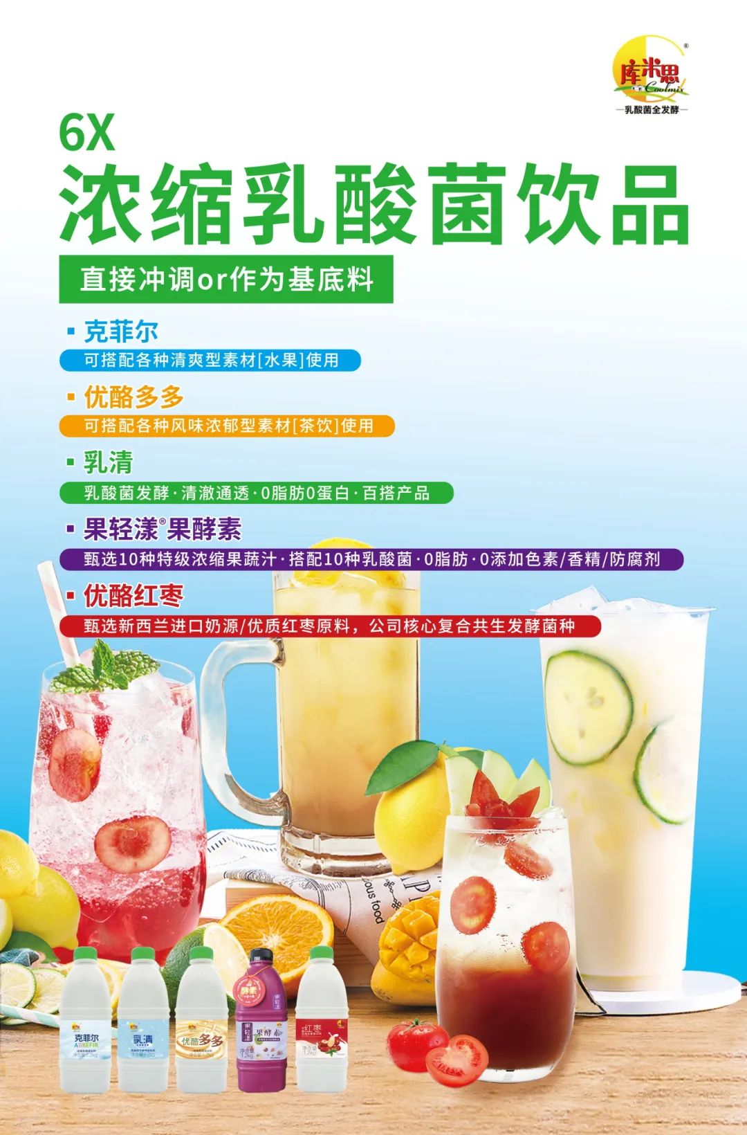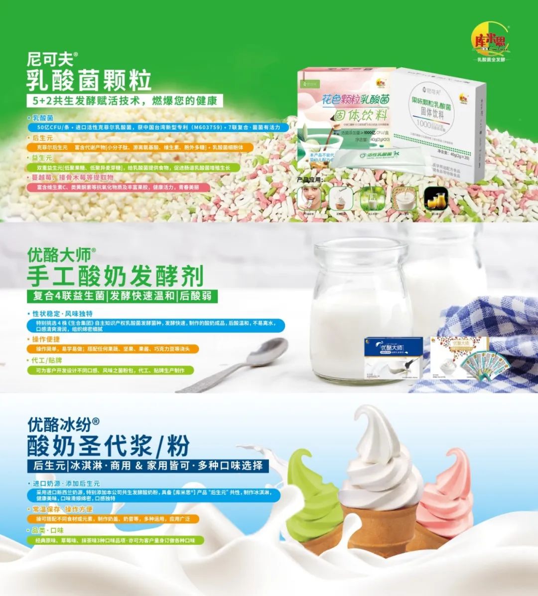 健康、天然、乳酸菌全发酵一直是生合所推崇和坚持的,唯有坚持“启动健康生活,从益生菌开始”的理念,方可让广大消费者认识、认知、接受。目前库米思®6X & 10X浓缩乳酸菌饮品、优酪大师®手工酸奶发酵剂,果轻漾®乳酸菌果酵素,尼可夫®花色/果味颗粒乳酸菌,优酪冰纷®酸奶圣代浆/粉,发酵康普茶,优酪红枣,已被业界广泛应用餐饮水吧、连锁餐厅等餐饮行业,并得到高度认可。