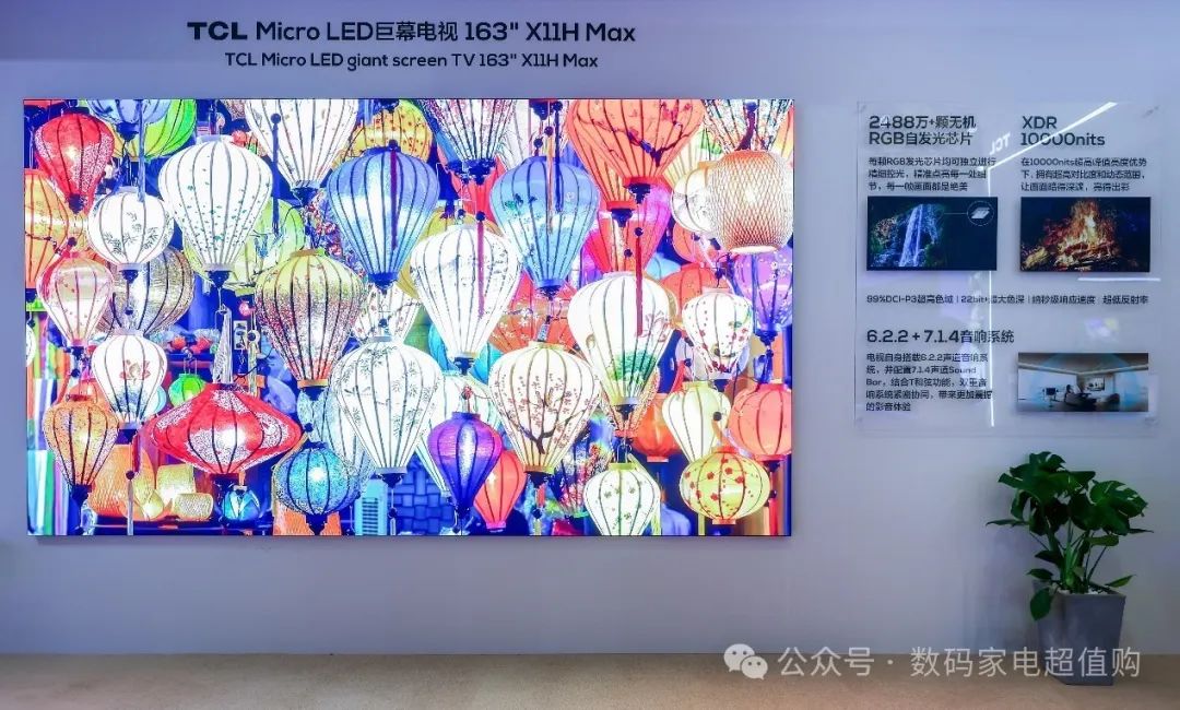 先说电视,毕竟是TCL看家主打产品线,也是目前出货量世界第二中国第一的产品线,这次把刚刚发布的三款新品都摆出来了,包括了目前最顶级的163英寸Micro LED巨幕电视X11H Max的真身、目前家用MiniLED电视的画质天花板X11H、以及在今年顶替Q10GPro扛起质价比大旗的超划算新品Q9K,都给人留下了深刻印象。