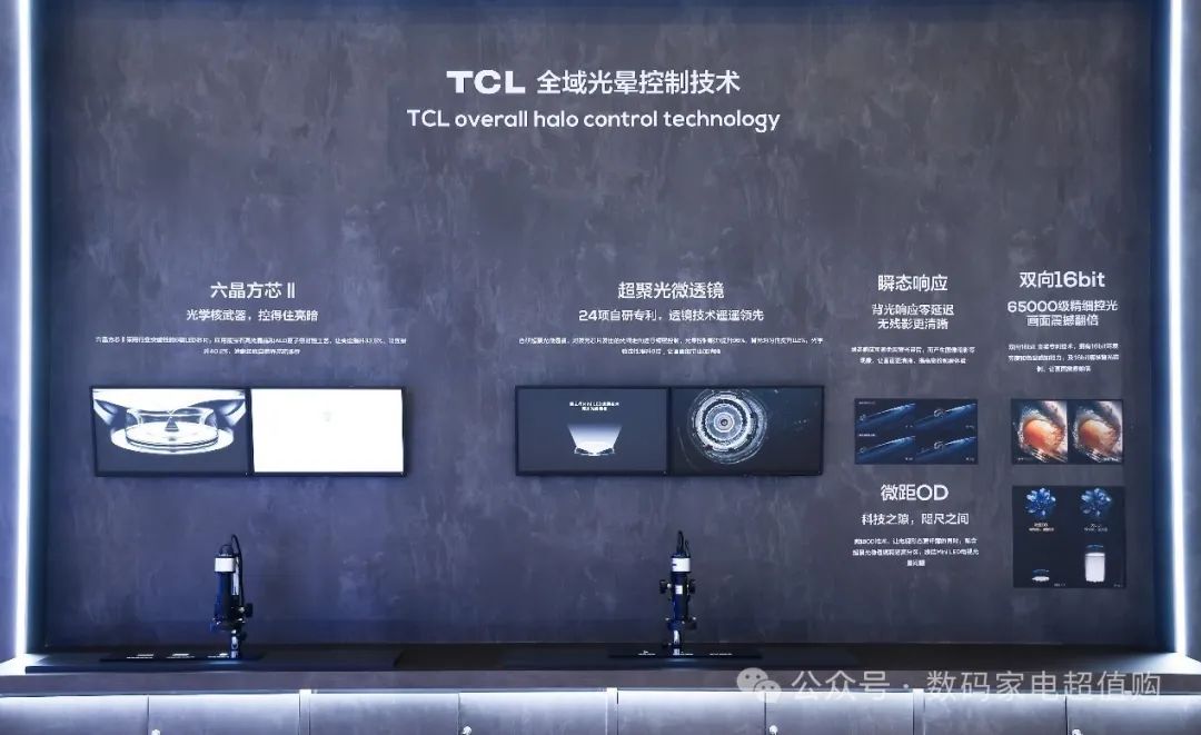 而且这次两台电视还都应用了最新的TCL全域光晕控制技术,毕竟MiniLED产品,谁能控制好光晕谁的画质就更强,而这次TCL这套解决方案直接让第二代六晶方芯、超聚光微透镜、瞬态响应、微距OD、双向16bit和A++蝶翼星曜屏(TCL华星VA软屏)共同作用,从6大方向同步协作解决这一问题,现场看画质真的好,这也是目前MiniLED电视里独一份的。