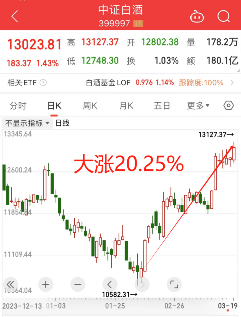 白酒最近的势头非常猛,中证白酒指数近一个月的时间涨幅达到20.25%,直接步入了技术型牛市。