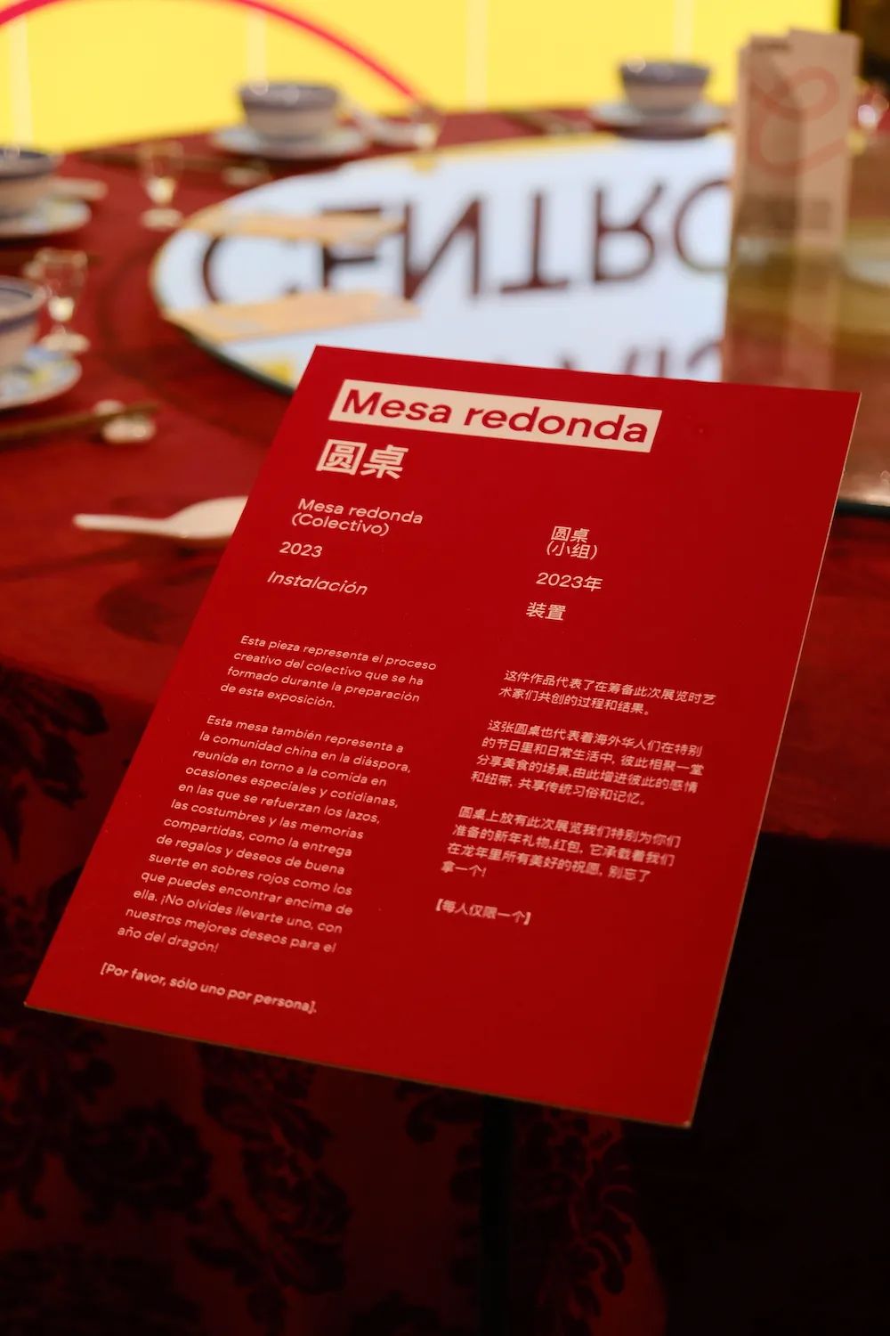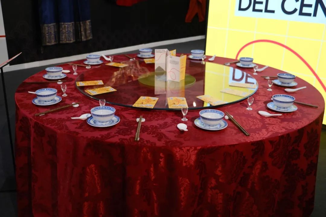 展览的入口是一张盖着红色桌布的大圆桌,摆着碗筷和展览介绍。旁边立着一个牌子讲解圆桌的寓意,xirou说开幕时这里还有红包壳子可以拿。