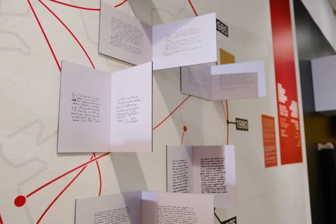 地图显示了从 1955 年到2030 年的时问轴,以及中国、西班牙、美国和拉丁美洲的地理区域。并用红线的元素,把每张照片的拍摄地点和时间串联起来。