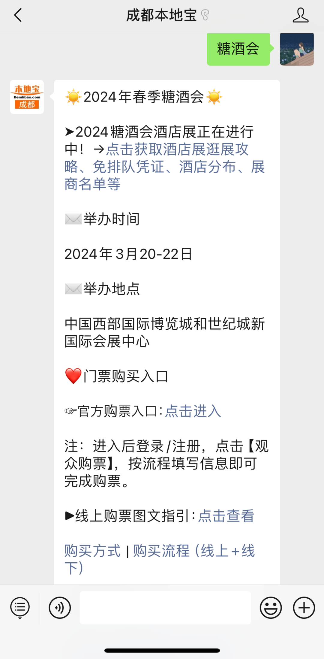 推荐服务:点击下方公众号名片,进入【成都本地宝】公众号,在对话框回复【糖酒会】直接获取普通观众购票入口、观展攻略、出行指南。