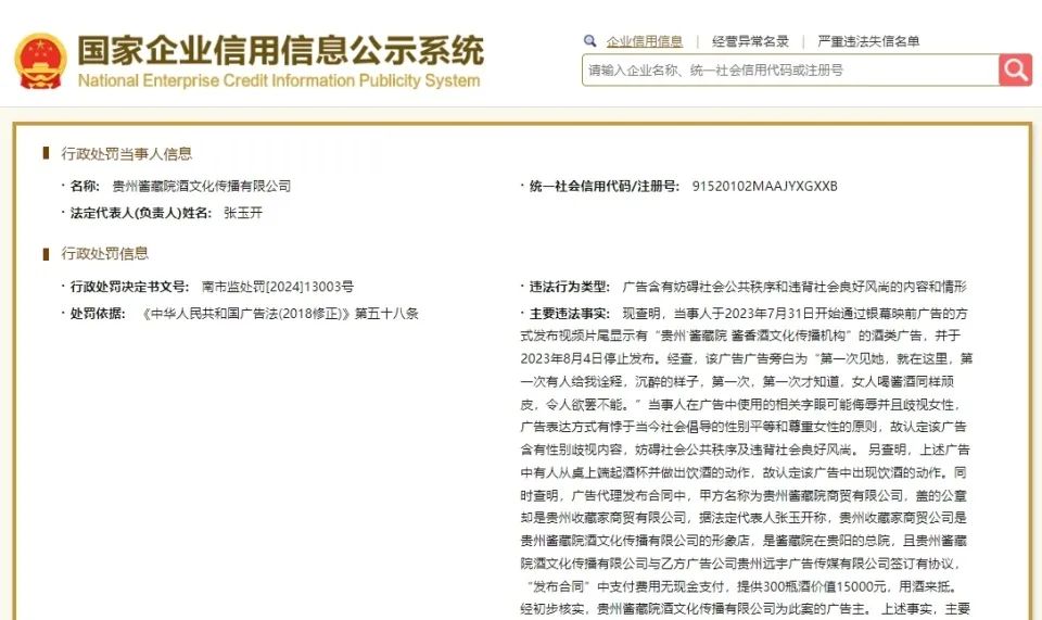 行政处罚决定书显示,现查明,当事人于2023年7月31日开始通过银幕映前广告的方式发布视频片尾显示有“贵州˙酱藏院 酱香酒文化传播机构”的酒类广告,并于2023年8月4日停止发布。