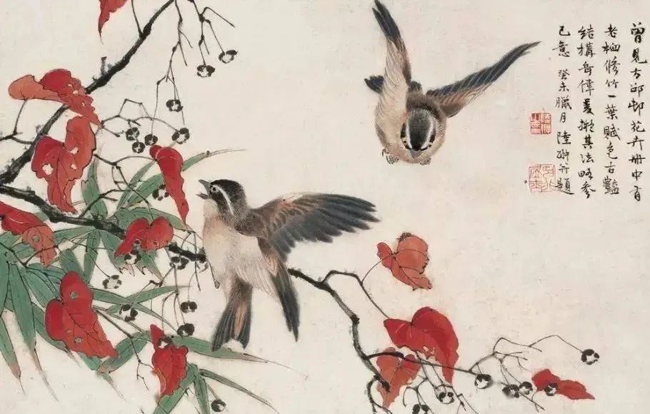 陆抑非画作《红叶小鸟》