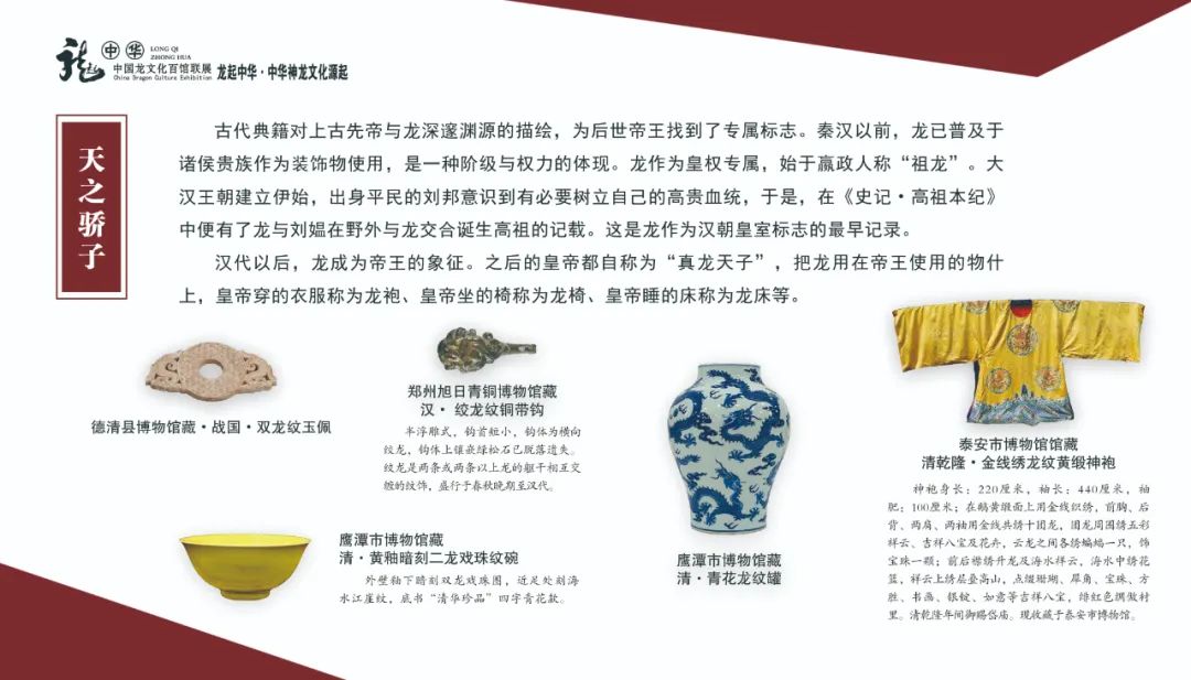 古代典籍对上古先帝与龙深邃渊源的描绘,为后世帝王找到了专属标志。秦汉以前,龙已普及于诸侯贵族作为装饰物使用,是一种阶级与权力的体现。龙作为皇权专属,始于赢政人称“祖龙”。大汉王朝建立伊始,出身平民的刘邦意识到有必要树立自己的高贵血统,于是,在《史记·高祖本纪》中便有了龙与刘媪在野外与龙交合诞生高祖的记载。这是龙作为汉朝皇室标志的最早记录。