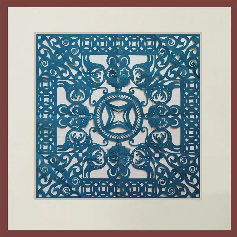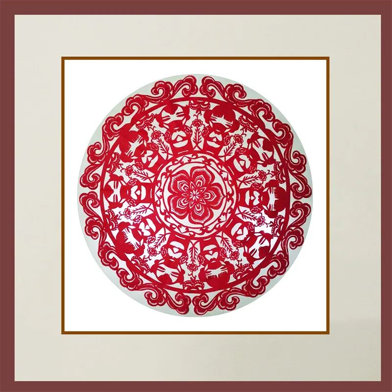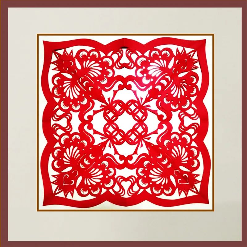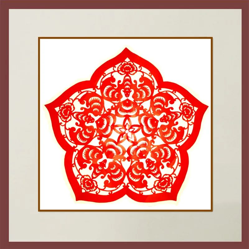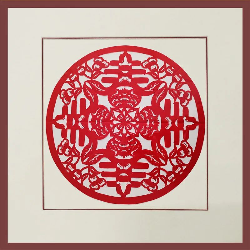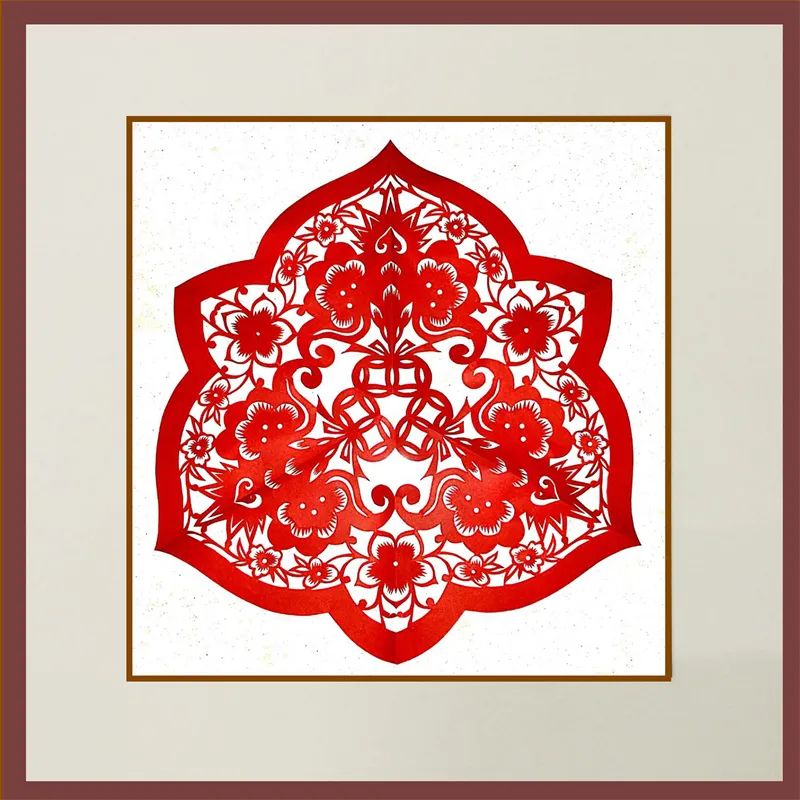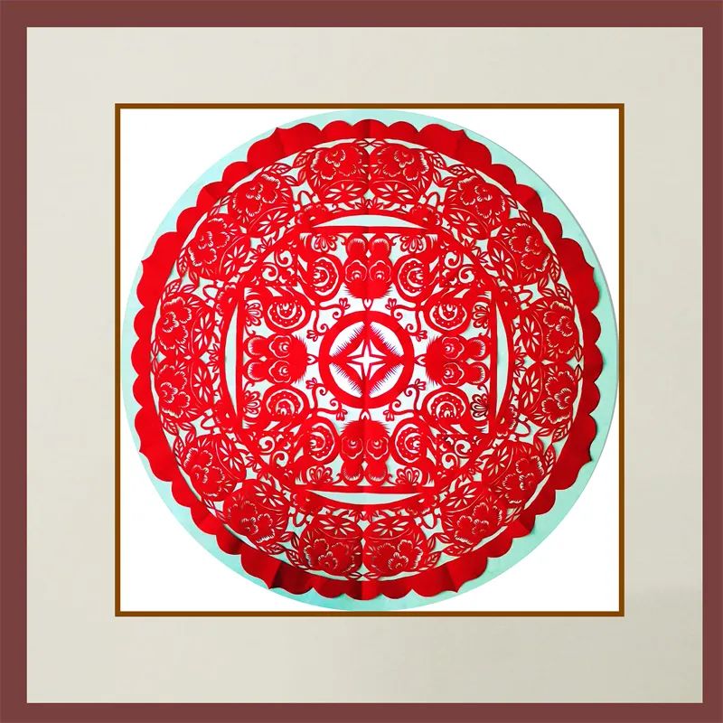 团花剪纸是我国历史最为悠久的剪纸方式,它具有圆形轮廓,以圆心为中心点,向外呈辐射状散开,各个符号自成单元,又相互勾连,极具特色。