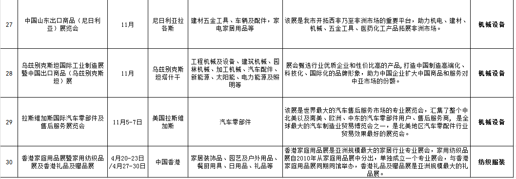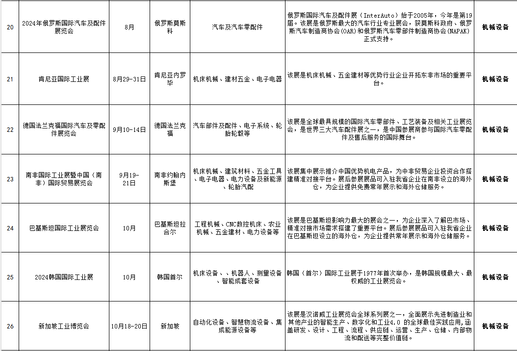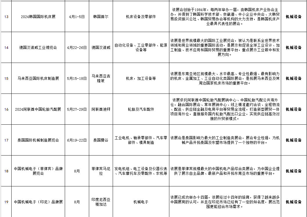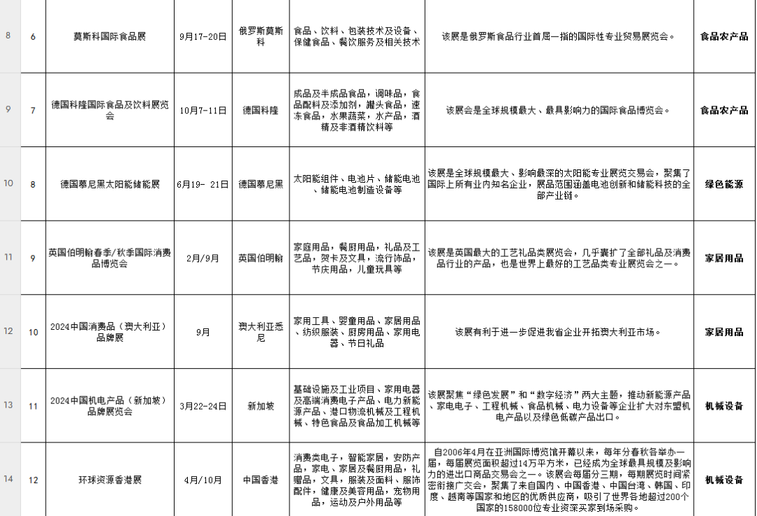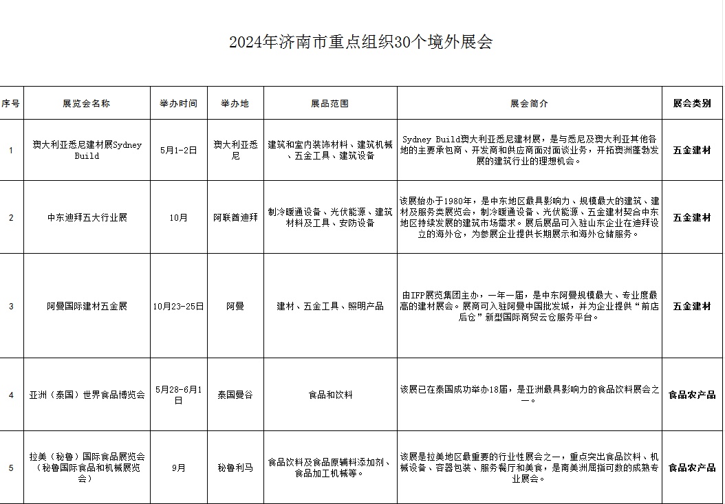 为指导企业精准“走出去”拓市场抓订单扩份额,引导企业开拓多元化国际市场,推动优化出口商品结构和国际市场布局,结合我市进出口实际和重点市场情况,市商务局制定了我市2024年境外市场开拓计划。2024年拟安排展会项目30个,均为线下展会。以 RCEP、“一带一路”、欧洲、非洲、拉美等区域20国市场为重点,重点推荐30个影响力较强的国际展会,按产品行业分,五金建材3个,机电类19个,食品农产品4个,纺织服装1个,家居用品2个,绿色能源1个。