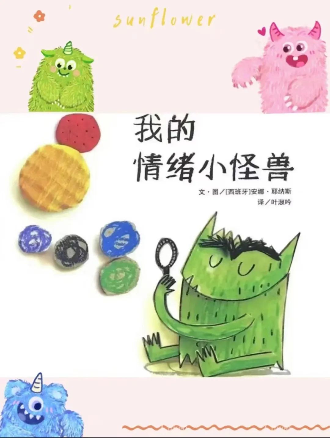 小怪兽感觉非常糟糕和混乱,就去向朋友求助。朋友告诉他应该先把各种颜色的情绪分开,于是它就变成了不同颜色的小怪兽,黄色代表快乐,蓝色代表忧伤,红色代表愤怒,绿色代表平静。黑色代表害怕,故事的结尾小怪兽变成了粉红色的,这又是哪一种情绪呢?