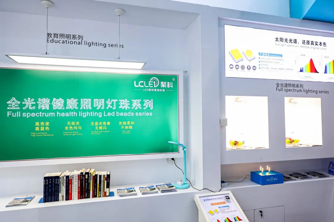 来自江门的聚科照明,也用大面积墙体空间展示全光谱健康照明灯珠系列,接近太阳可见光谱(即仿自然光)照明,能达到无眩光、无蓝光、无频闪、98显色指数;