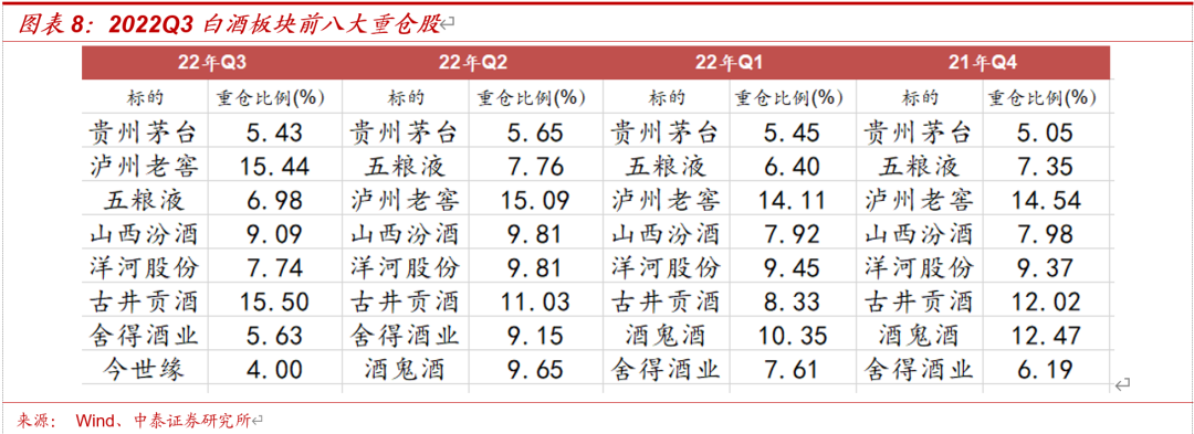 从白酒板块前八大重仓股来看,可以得到结论如下:高端酒持仓比例提升,茅、五、泸仍为白酒板块重仓股前三,同时在全市场十大重仓股中占据第1、3、4名的位置;其中贵州茅台全市场持仓保持第1,22Q3基金重仓比例为5.43%,环比下降0.22pct,接近22H1水平。泸州老窖重仓排名继续提升2位至第3,22Q3重仓比例15.44%,环比提升0.35pct,连续2个季度保持增长。五粮液稳定处于第4,22Q3重仓比例6.98%,环比下降0.78pct。山西汾酒排名上升1位到第6,22Q3重仓比例环比下降0.72pct至9.09%,洋河股份下滑1位至第17,22Q3持仓比例环比下降2.07pct至7.74%。