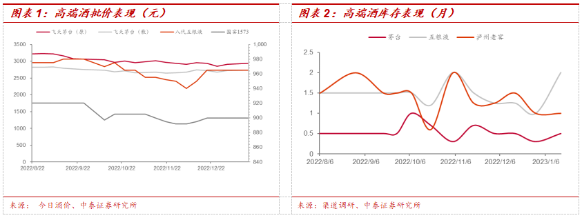 (1)高端、超高端:批价表现稳中有升,库存环比略有上行。贵州茅台:散瓶价格上涨幅度高于整箱,主要原因系临近春节送礼、自饮需求旺盛,一月份到货后价格仍保持上行,预计节后价格不会有较大波动,库存水平保持低位;五粮液:目前经销商层面库存水平由于到货先后顺序原因出现分化,批价在965元左右,环比保持稳定;泸州老窖:目前经销商库存预计约一个月,高度国窖批价稳定在900元左右,低度批价稳定在630元左右;