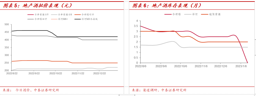 (2)次高端:批价保持稳定,渠道库存有所上行。山西汾酒:公司整体发货进度较快,整体批价由于到货速度快出现小幅下滑,同时酒厂在费用核销方面速度加快,预计年后批价将出现回升;舍得:目前智慧舍得批价稳定在450元左右,目前库存水平在20%安全库存水平内;酒鬼酒:目前价格支撑性较强,库存方面环比较稳定,目前库存水平保持20%左右;
