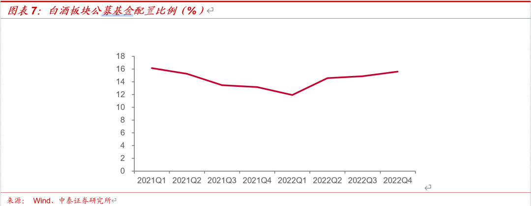 从公募基金持仓比例来看,全年来看,自2022Q1白酒板块公募基金持仓比例降至低点后迎来快速反弹,2022Q2以来白酒板块公募基金持续加大持仓比例,四季度疫情管控放开后白酒板块公募基金持仓比例上升至15.57%。