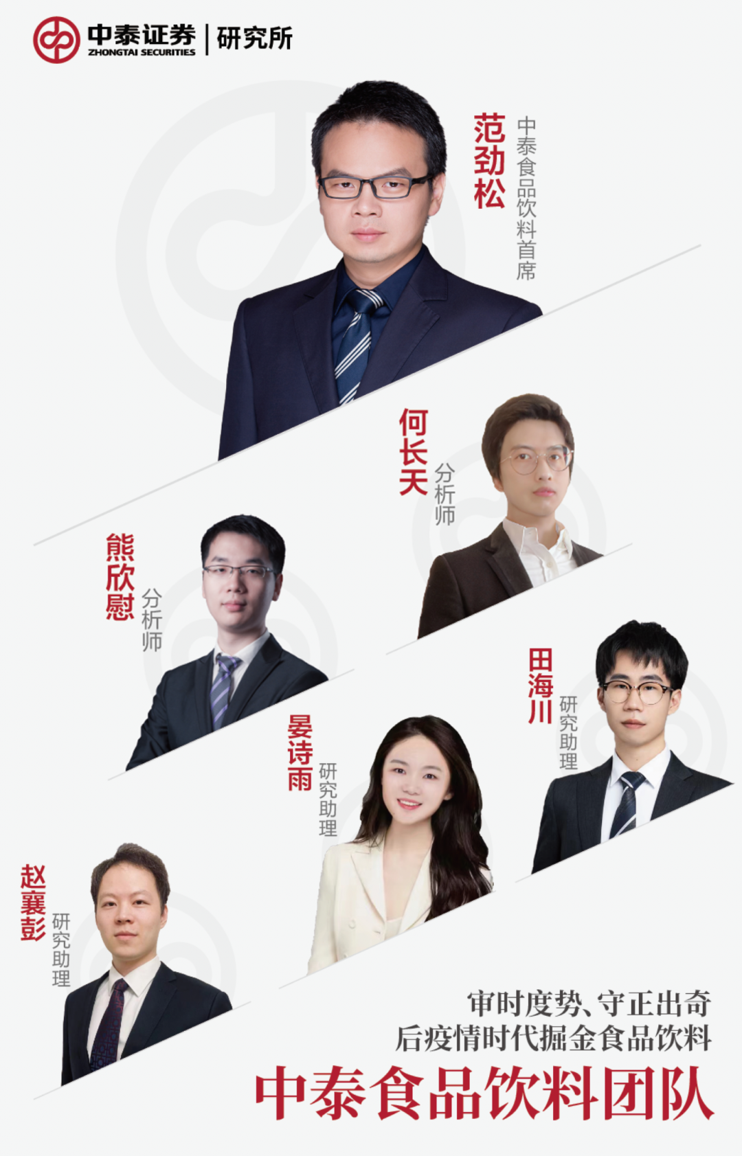 本订阅号为中泰证券食品饮料团队设立的。本订阅号不是中泰证券食品饮料团队研究报告的发布平台,所载的资料均摘自中泰证券研究所已经发布的研究报告或对已经发布报告的后续解读。若因报告的摘编而产生的歧义,应以报告发布当日的完整内容为准。请注意,本资料仅代表报告发布当日的判断,相关的研究观点可根据中泰证券后续发布的研究报告在不发出通知的情形下作出更改,本订阅号不承担更新推送信息或另行通知义务,后续更新信息请以中泰证券正式发布的研究报告为准。