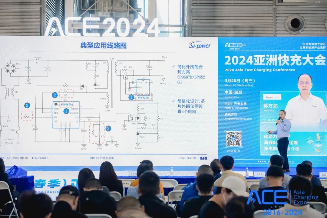 展会期间,无锡硅动力市场应用总监蒋万如先生受邀出席,以《高频&高效氮化镓充电解决方案介绍》为主题发表演讲。介绍了硅动力长期耕耘在AC/DC电源管理领域,目前产品已完整覆盖1-500W功率段、小体积、高效率的整套电源解决方案,产品广泛应用于快充、适配器、家电、电表、显示屏等领域。