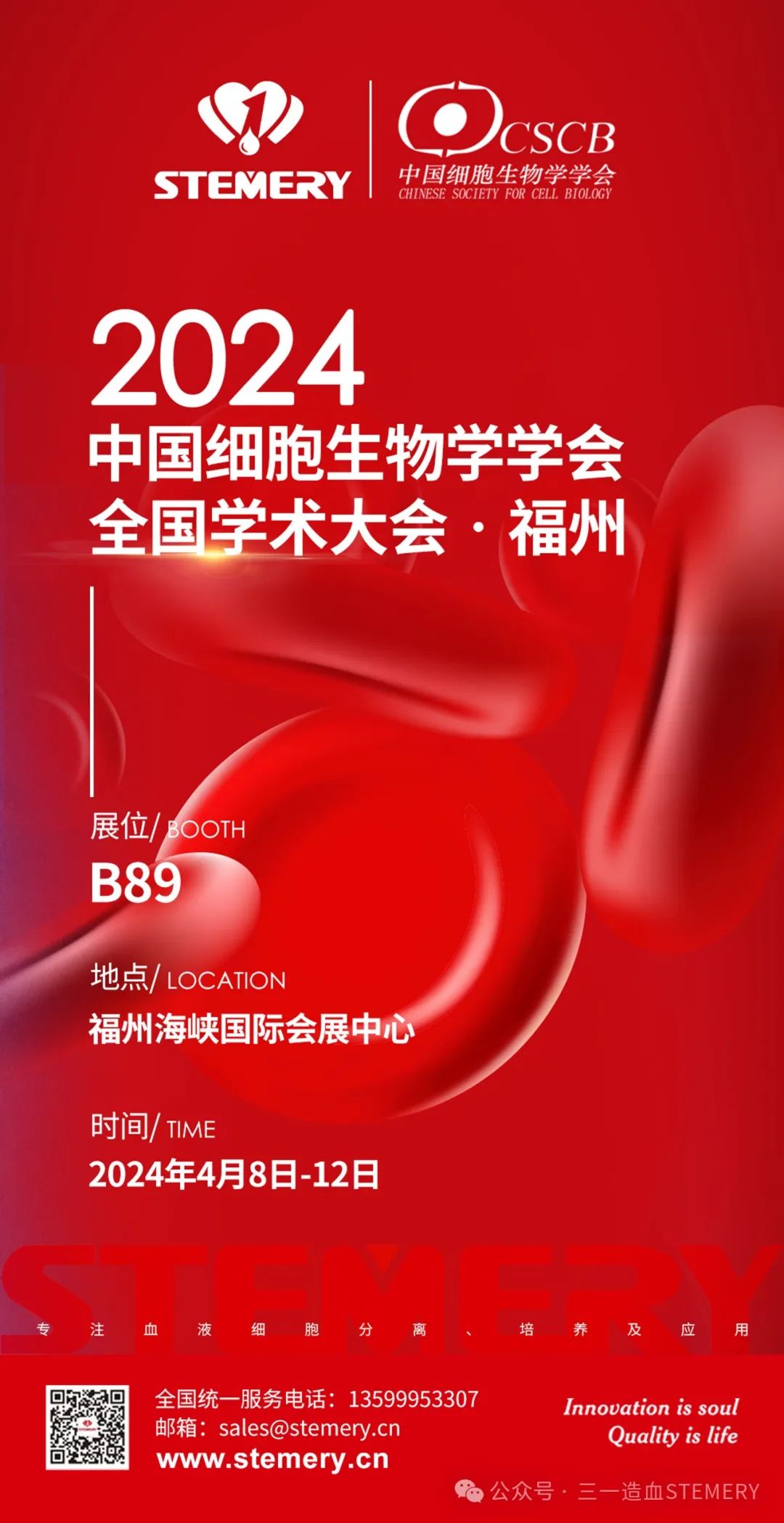 2024年4月8日-2024年4月12日,中国细胞生物学学会2024年全国学术大会•福州,将在福州海峡国际会展中心盛大举行,届时,三一造血携包括自解离细胞分离,全血细胞分离以及DC细胞扩增,Treg扩增多款重量级血液细胞精准分离及高效扩增产品亮相展会。