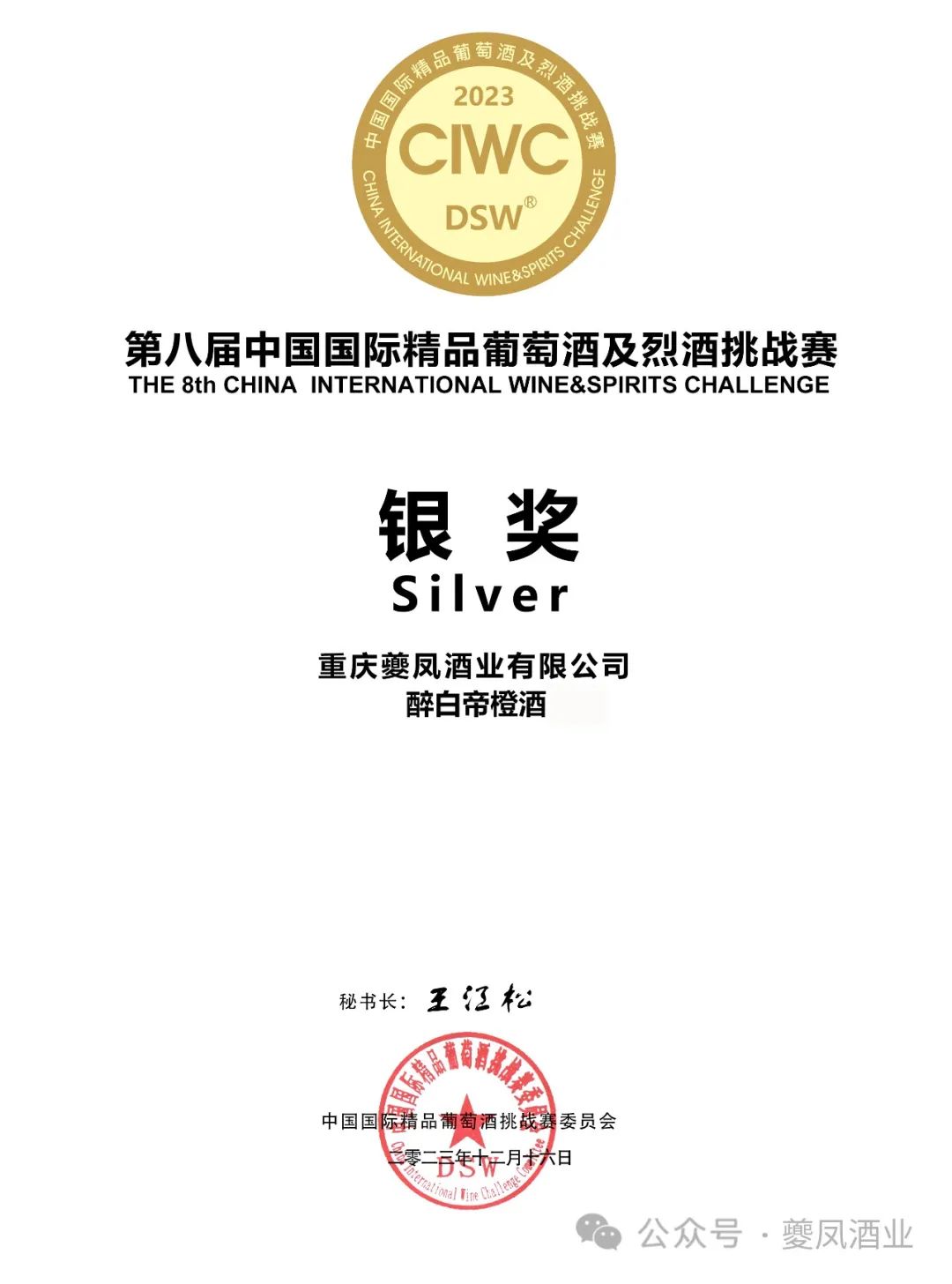 2023年12月16日,由中国国际精品葡萄酒及烈酒组委会(简称DSW)主办的第八届中国国际精品葡萄酒及烈酒挑战赛(简称CIWC)在青岛举行,在来自全国20多位评委的盲品下,评出了干白组、干红、水果、蒸馏酒、加强型酒、威士忌等组别奖项。其中,夔凤酒业的醉白帝-橙酒在众多葡萄酒中脱颖而出,斩获银奖!