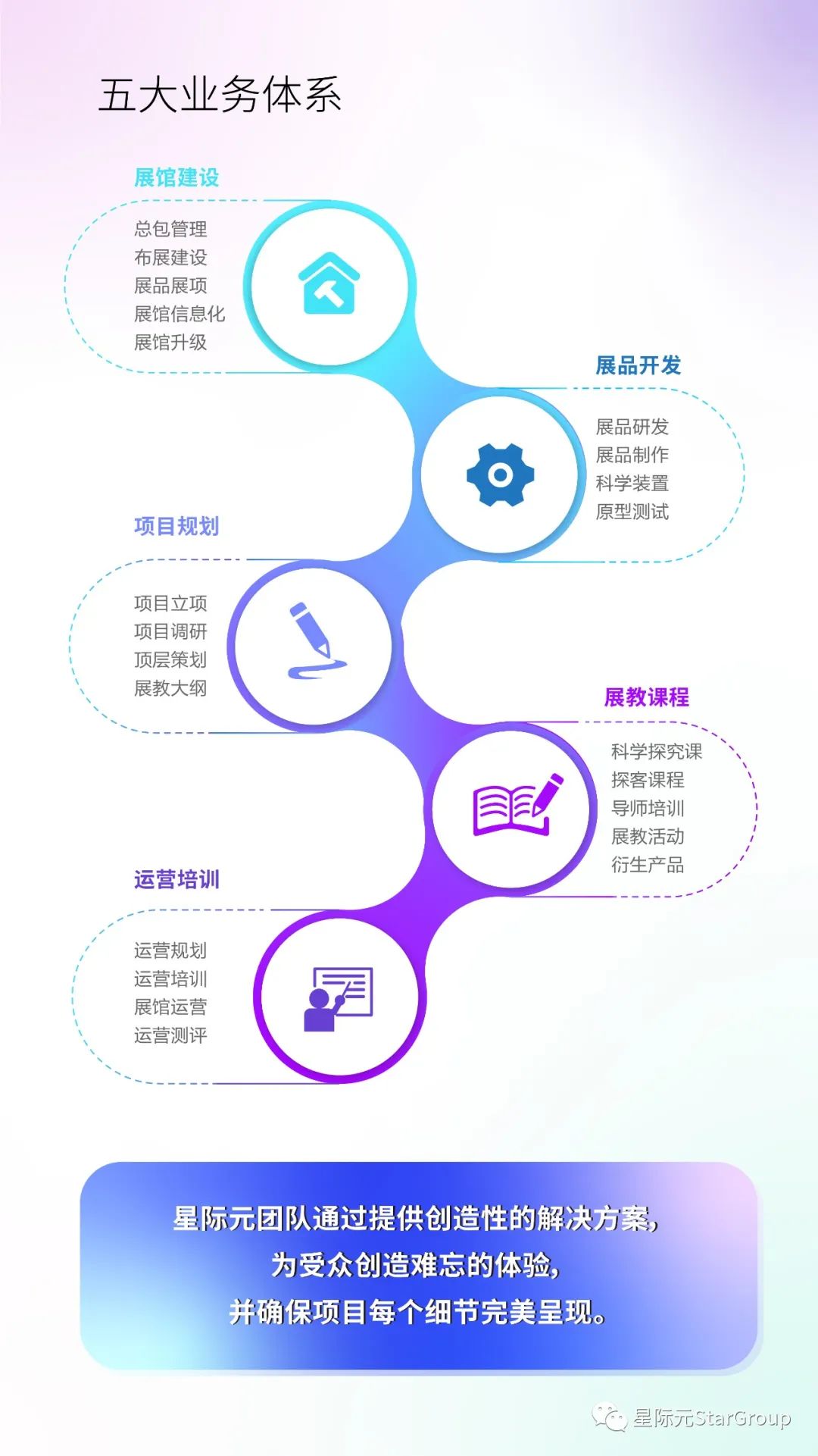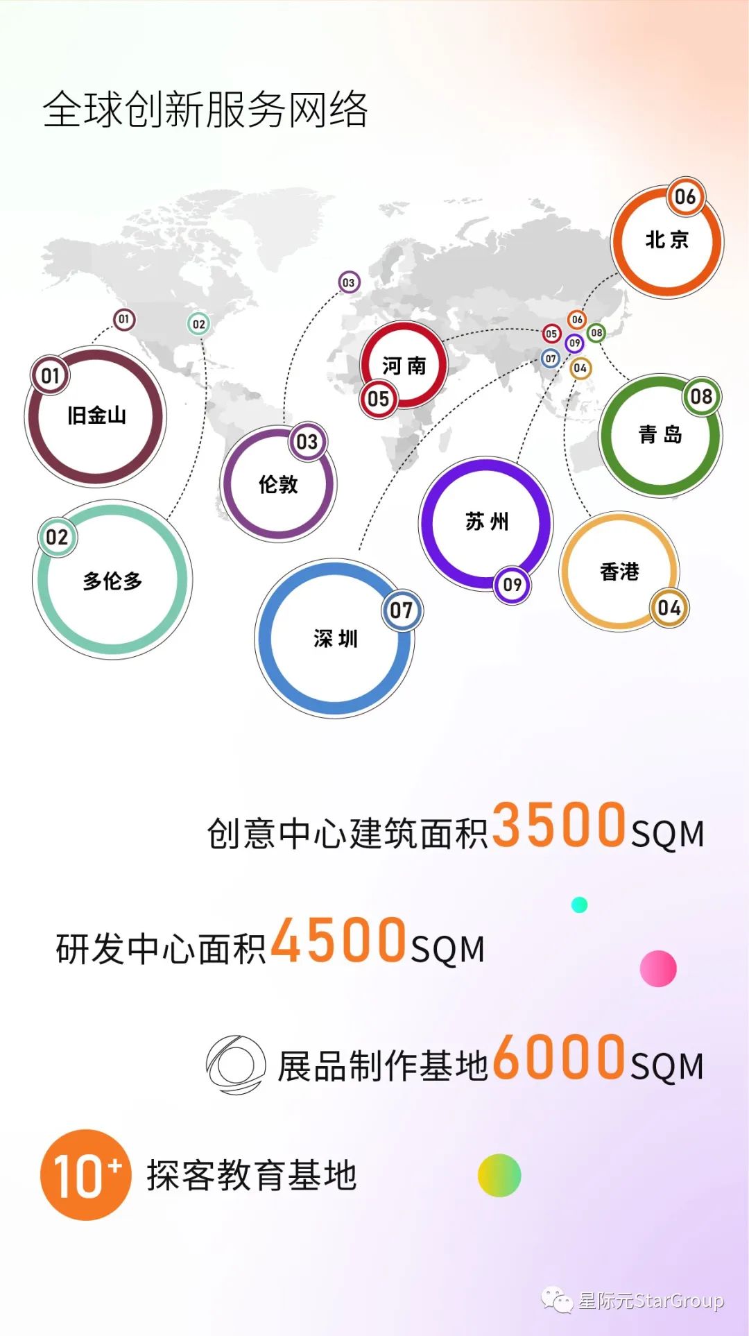 星际元StarGroup始终围绕文化、教育与科技深度融合为宗旨,不断创造“文化+教育+科技”引领新经济。以国际跨界融合式创新模式,自主研发数百项科技产品,拥有世界优质资源及核心专业网络,驱动世界联合创新开发机制,以“World+Local”(世界与本土相结合)的创新理念。洋为中用,自主创新。整合全球化资源,汇聚科普创新人才,建立四大全球科普展品研发中心,联合世界八大顶级科技馆,六家国际顶级展品制作机构,常态开发展品、展教系列产品。凭借专业技术团队,从顶层策划、方案设计、展项研发、工程实施、智能化场馆、项目运营到管理培训及数字化解决方案的专业创新供应链体系。创造出世界级品质并落地中国的项目成果,开创多个科普创新的先行示范,并荣获多项专业奖项。