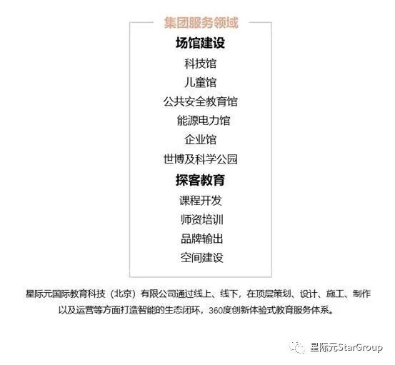 星际元StarGroup成立于2000年,专注于提供科普创新的整体解决方案。整合国际资源,与世界同步、与世界互联、与世界共创,持续开发面向学校、家庭、社区及科技场馆的创新体验式教育新路径,探索行业发展新趋势,推动中国科普事业的发展与创新型人才的培养。