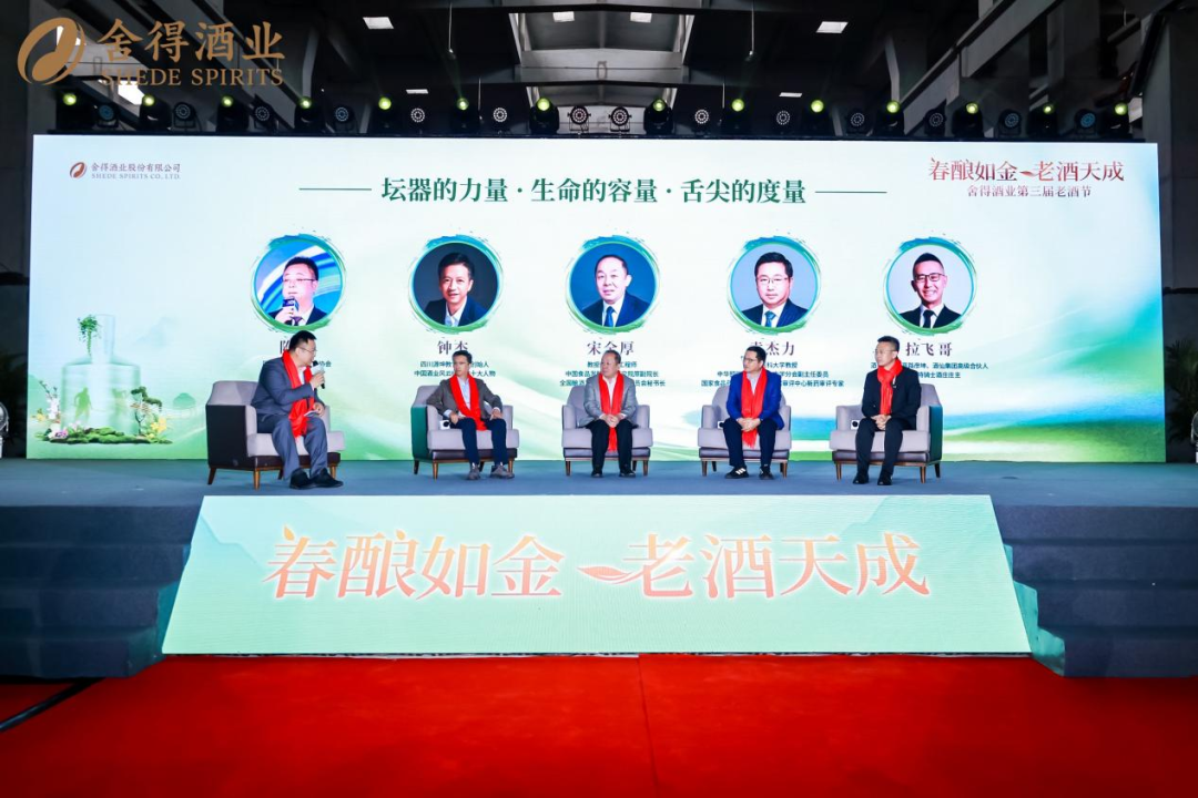 在四川中国白酒金三角酒业协会副秘书长陈雷主持下,全国白酒工业标准化技术委员会秘书长宋全厚,中国著名白酒专家、源坤教育创始人钟杰,大连医科大学教授袁杰力,酒类带货一哥、酒仙集团高级合伙人拉飞哥四位各领域的专业人士,以“坛器的力量 生命的容量 舌尖的度量”为主题,从专业角度讲述老酒故事,辨析坛储老酒的品质价值,探讨如何用科技为老酒品质保驾护航,让更多消费者体验舍得老酒的独特魅力。