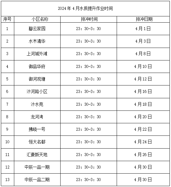 为提升区域用水水质、保障市民用水安全,宿州供水公司拟定于2024年4月对已接收管理的住宅小区内部供水管网(含二次供水管网、水箱)分时段、分区域进行水质提升作业。作业期间影响所在小区市政管网3楼以上住户及高层住户用水,请您在水质提升作业时段关闭家中水龙头和用水设施,以免在恢复正常供水后造成浪费或家庭财产损失。2024年4月区域(住宅小区)水质提升具体计划如下: