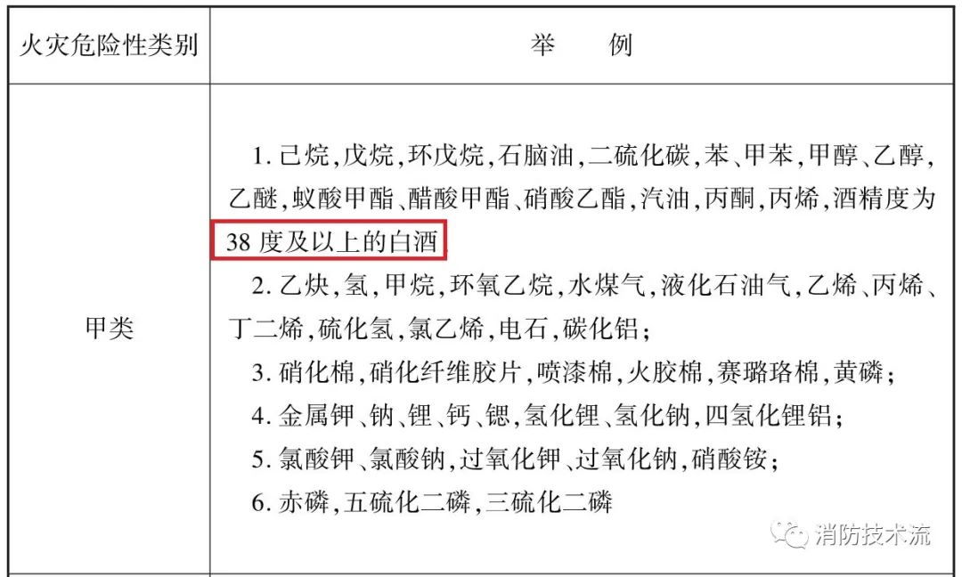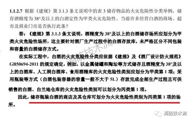 问:根据《建规》第 3.1.3 条文说明中的表3储存物品的火灾危险性分类举例,储存酒精度为 38°及以上的白酒定性为甲类火灾危险性。当前许多经营白酒的商场、超市及商业门市是否执行此条?