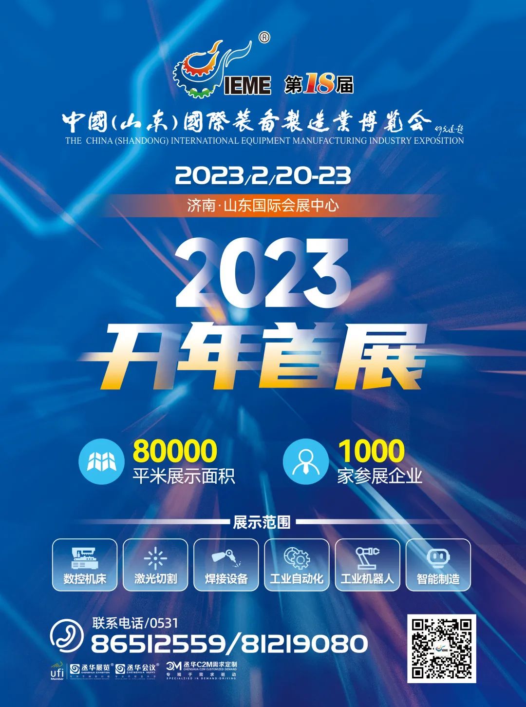2023第十八届中国(山东)国际装备制造业博览会定于2023年2月20-23日在山东国际会展中心(槐荫区)举办,主要展示数控机床、激光切割、工业自动化、工业机器人、工业互联网、智能装备、功能部件、工量具、农业机械、煤炭机械等方面的最新技术及产品。